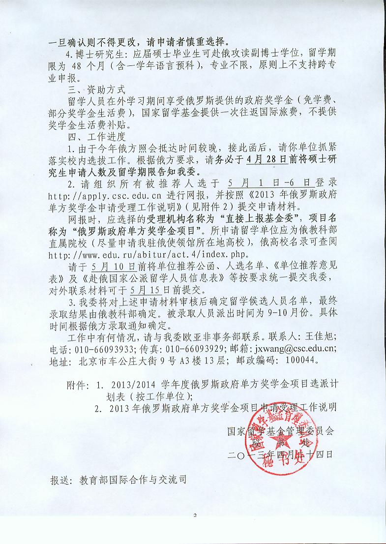 2013年俄罗斯政府单方奖学金申请受理工作说明