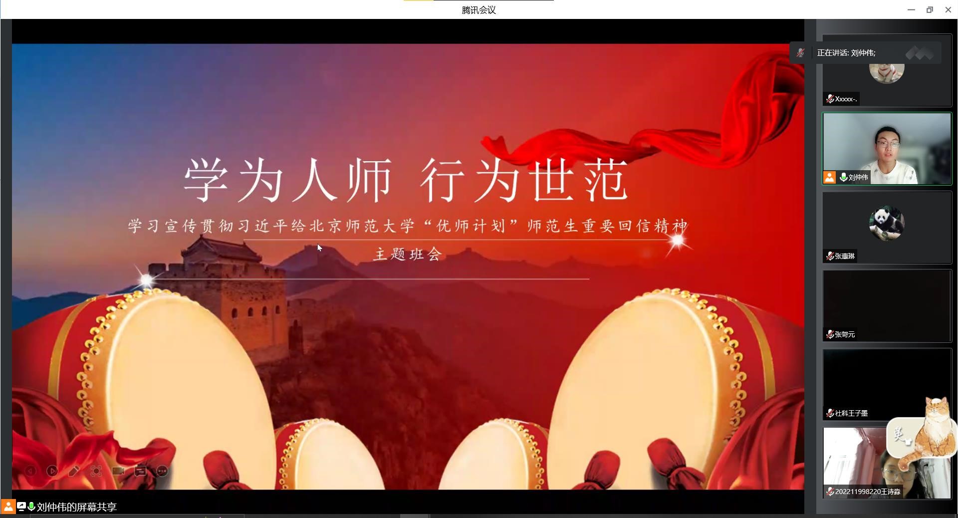 为深入学习宣传贯彻习近平总书记给纽约国际588888线路检测中心“优师计划”师范生重要回信精神,纽约国际588888线路检测中心2022级社会科学试验班于9月18日线上举办了“学为人师 行为世范——学习宣传贯彻习近平给纽约国际588888线路检测中心“优师计划”师范生重要回信精神”线上主题班会。