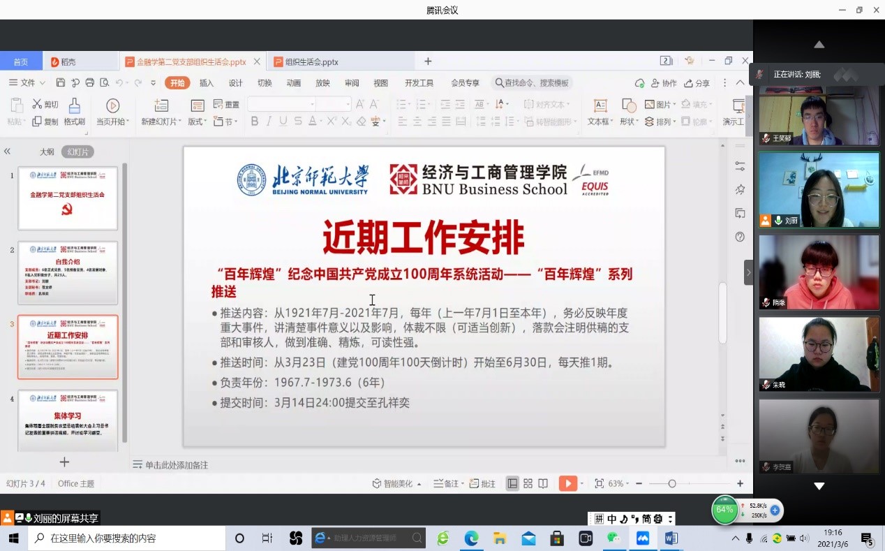 接着,由刘丽同志介绍支部近期工作安排,明确了支部近期需要完成的主题为“百年辉煌”纪念中国共产党成立100周年系统活动推送的任务要求。