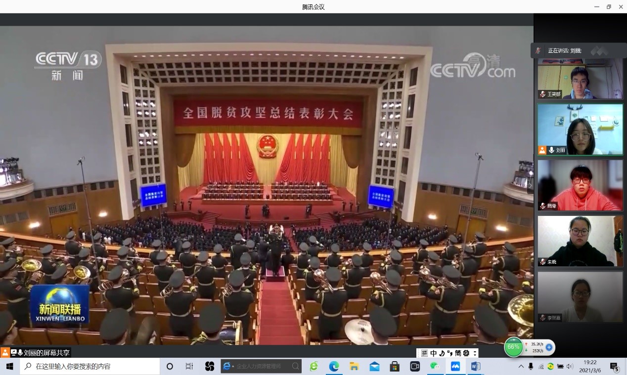 罗战同学谈到了两个关键词:钦佩、感恩,钦佩于在中国人口规模如此庞大的情况下党能够带领全国人民完成精准扶贫这项彪炳史册的人间奇迹,感恩于广大扶贫干部为了兑现“一道奔小康”的承诺,任劳任怨无私奉献,把心血和汗水洒遍千家万户。郭凡溶同学以“时代造就英雄,伟大来自平凡”为引,分享了“最美乡村教师”张桂梅同志的故事,“俯首甘为孺子牛”是对其崇高奉献精神的生动写照,我们应当积极践行并传承这种奉献精神。王昊宁同学分享了村支书毛相林同志带领村民艰苦奋斗摆脱贫困的故事,我们这代人应当继承和发扬这种“愚公精神”,同时他还谈到自己亲身下乡调研的经历,深刻感受到从精神上斩断穷根的重要性。李贺嘉同学以张桂梅同志为例,阐述了不忘初心的重要意义,谈到我们应当不断锤炼为人民服务的本领,在实践中彰显自己的人生价值。范文婷同学以黄文秀同志为例,深刻感受到黄文秀同志对党的事业的无限忠贞与热爱,她舍小家为大家,无私奉献勇于牺牲的崇高品格是我们青年人学习的榜样。