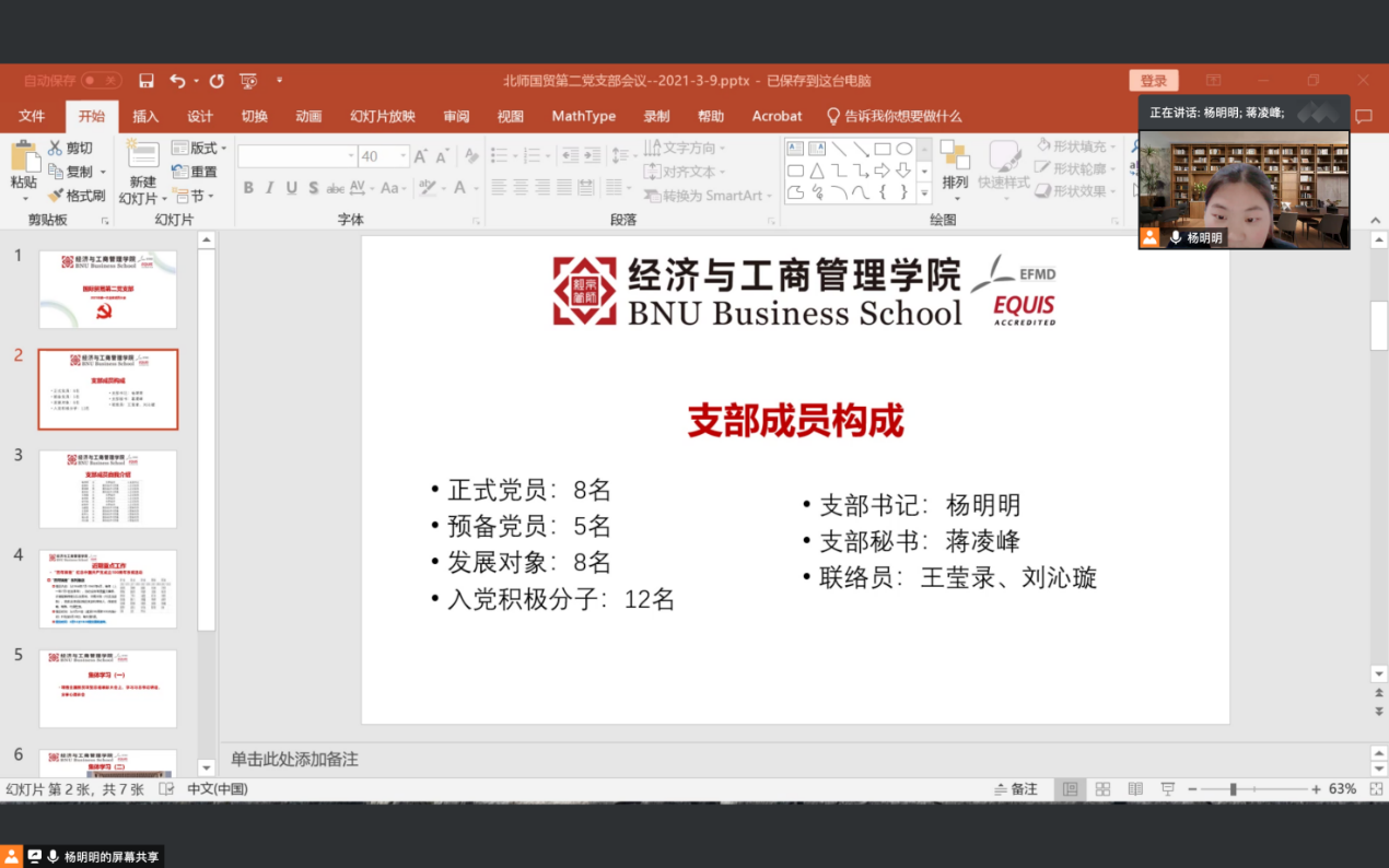首先,支部书记杨明明同志介绍国际贸易第二党支部基本情况。支部现有8名正式党员,5名预备党员,8名发展对象,12名入党积极分子。其中包括4名党员学生干部,分别是1名支部书记、1名支部秘书及2名联络员。全体参会人员逐一进行自我介绍。杨明明同志鼓励大家在今后的党建活动中共同学习,一起进步,希望今后支部成员能够进一步的了解与联系。随后,支部书记介绍支部近期重点工作,划分小组积极参与“百年辉煌”纪念中国共产党成立100周年系统活动。