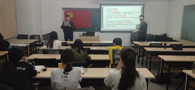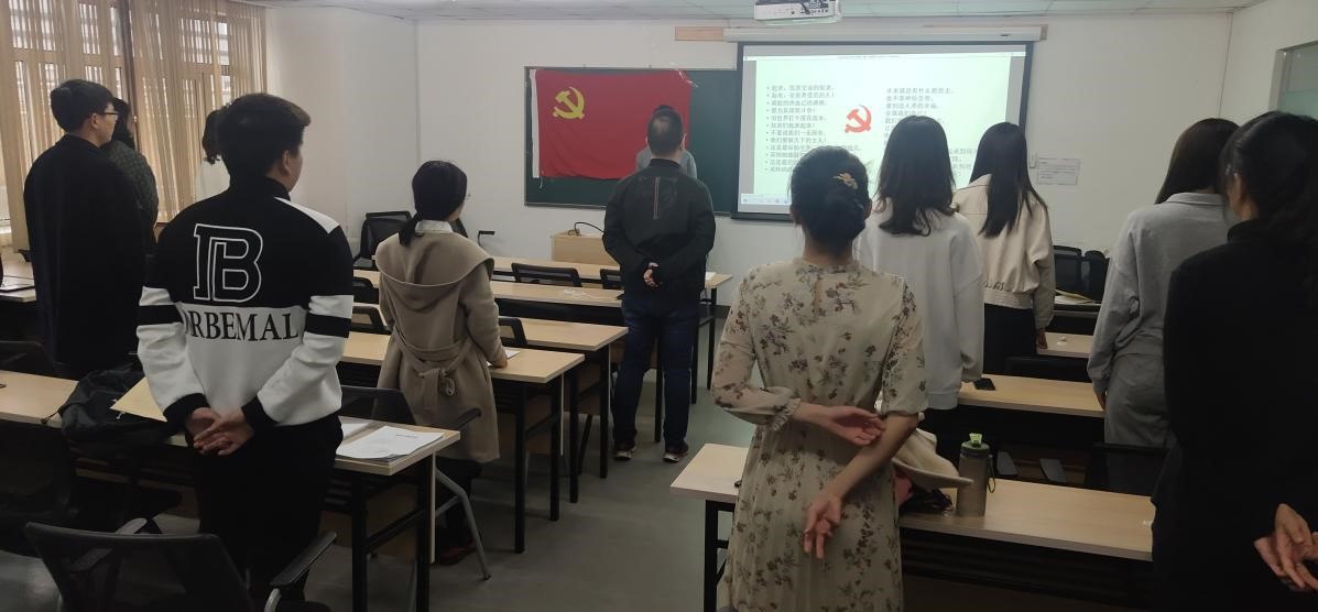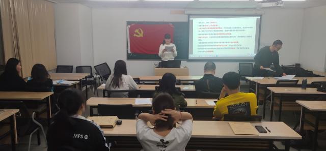 首先,党支部全体成员起立,合唱《国际歌》。支部书记袁胜轩同志清点会议出席人数,并介绍各发展对象的基本情况。发展对象在党旗下宣读《入党志愿书》,向党组织汇报个人对党的认识、入党动机,并进行了履历梳理和自我剖析。接着,入党介绍人介绍发展对象的有关情况,并对其能否入党表明意见。支部党员袁璐璐同志宣读发展对象的政审报告及公示结果。基于以上信息,支部成员充分讨论发展对象的优缺点,并帮助其增强自我认识,明确努力方向。