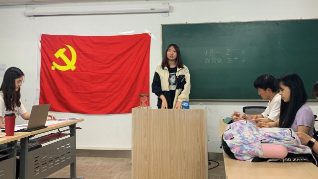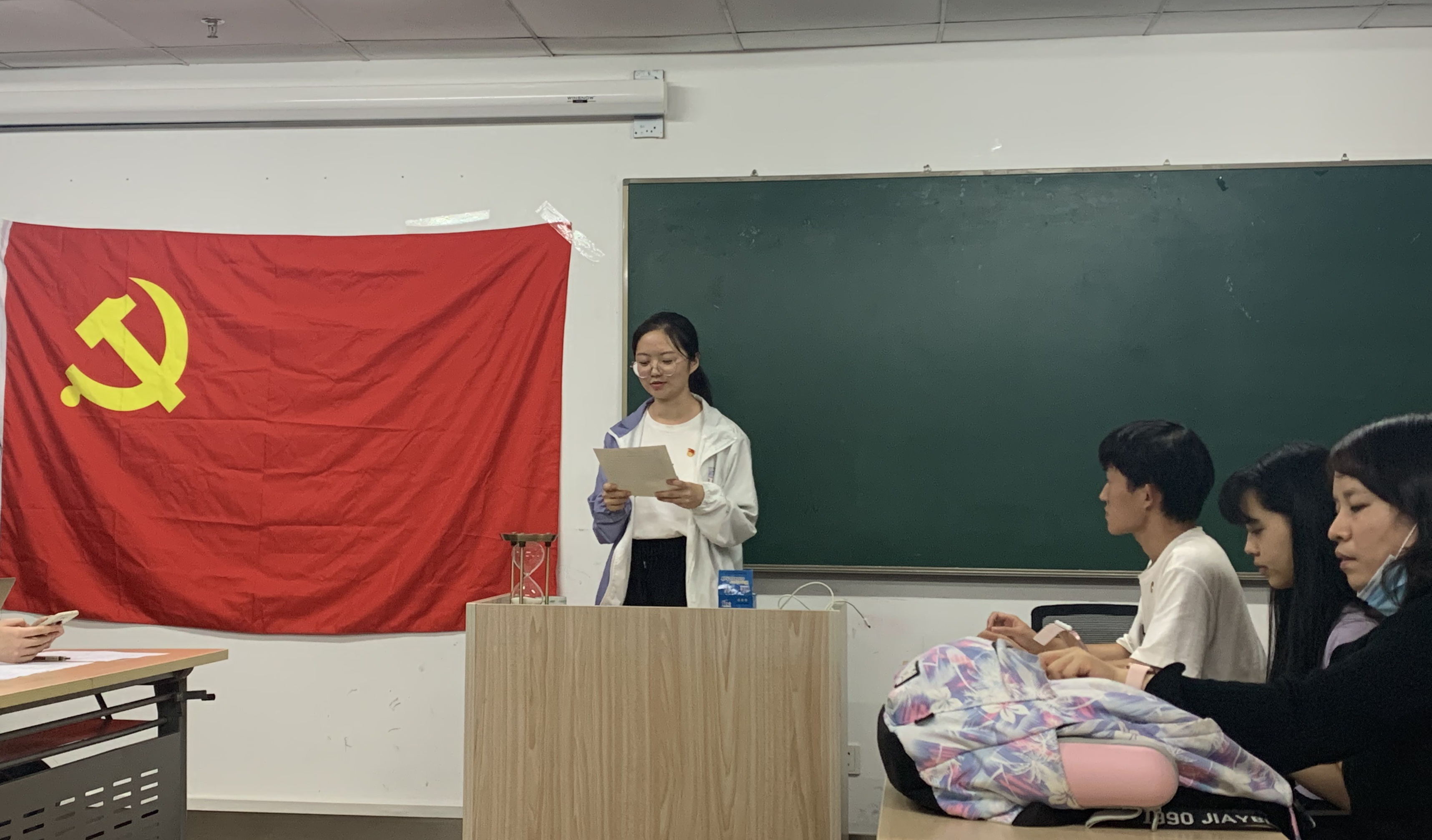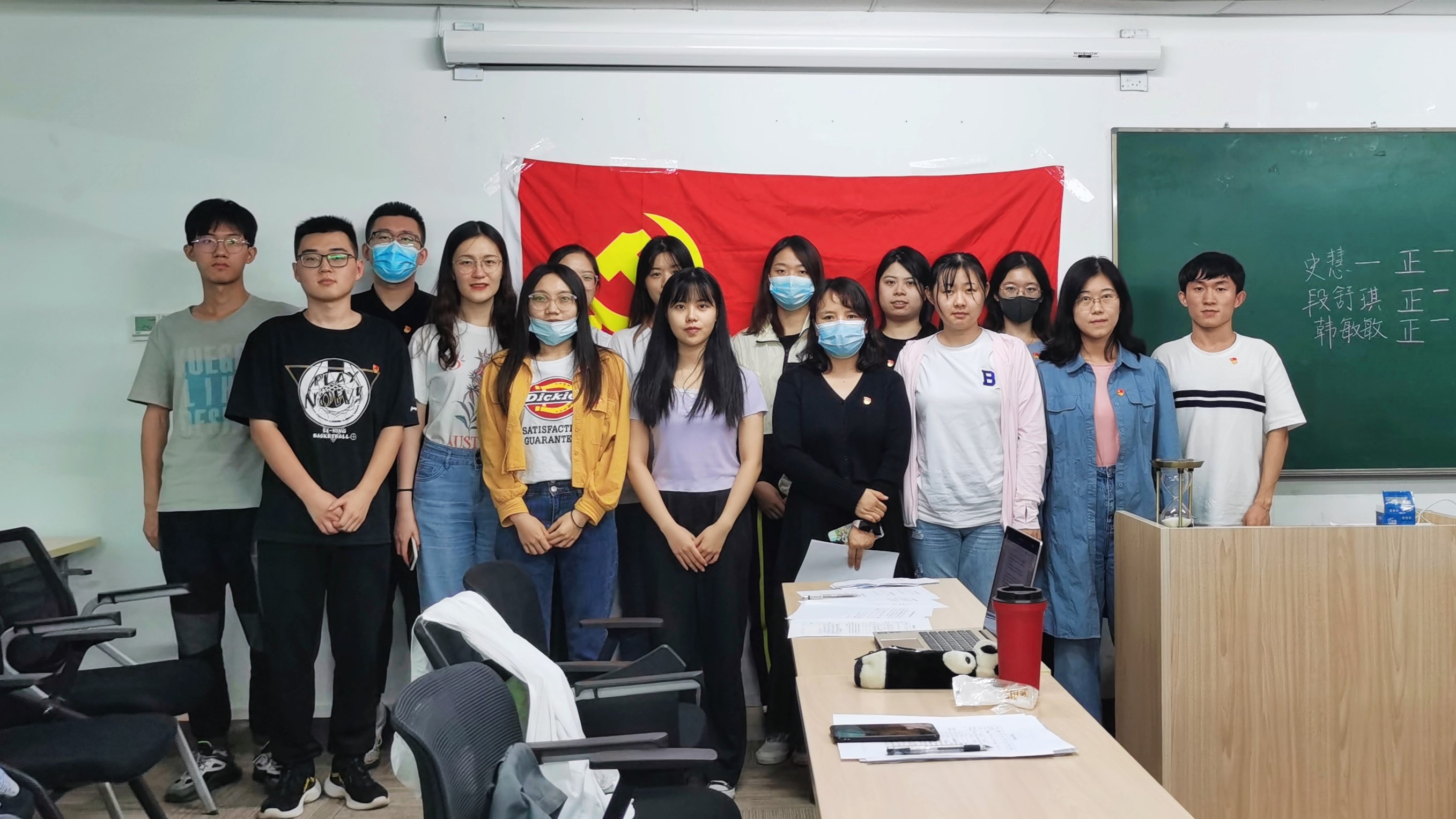 会议开始,全体起立,面向党旗奏唱《国际歌》。党支部书记杨理钧介绍本次会议党员的出席情况,宣布会议结果有效。杨理钧同志欢迎本学期新加入的党员韩敏敏同志和赵智勇同志,两位同志进行了自我介绍,支部全体成员对两位同志的加入表示热烈欢迎。