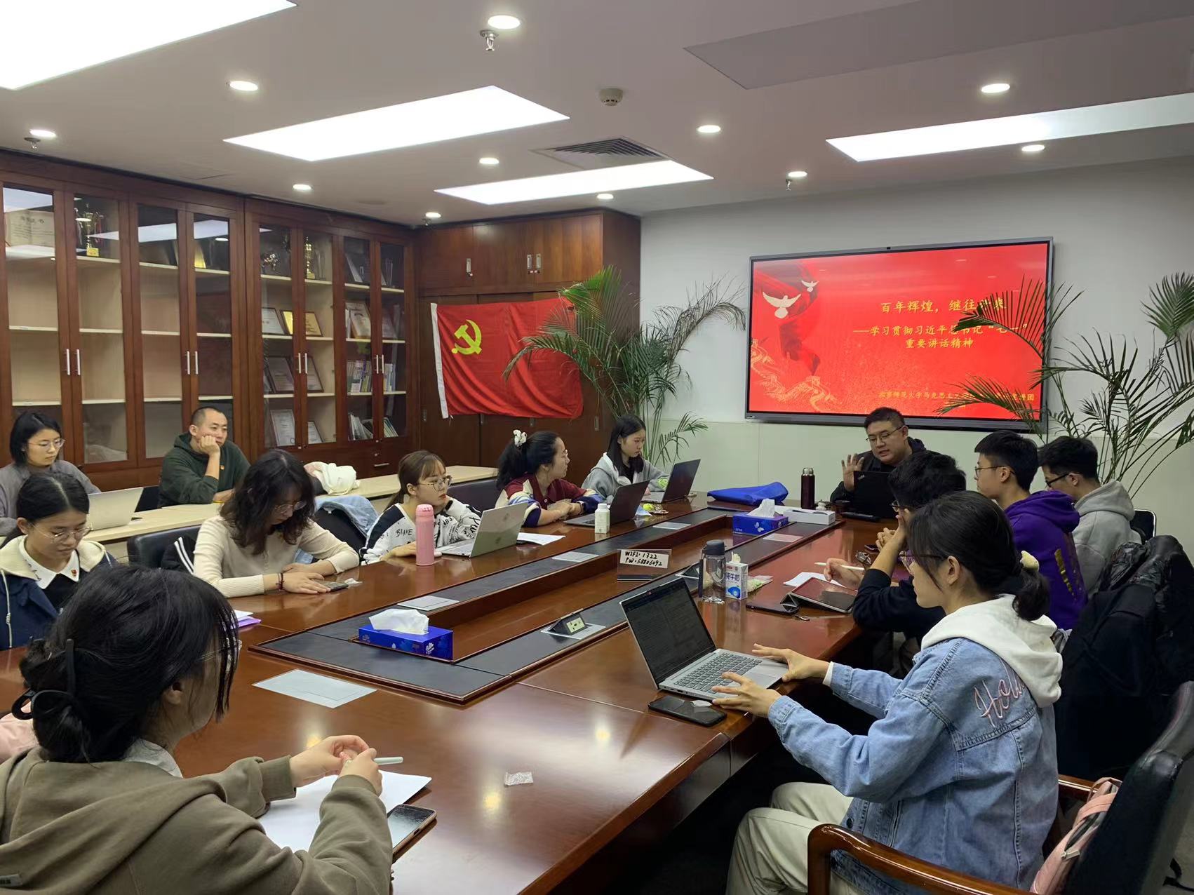 2021年10月15日,纽约国际588888线路检测中心经济学第一党支部于后主楼1722会议室召开学习交流会,邀请马克思主义学院求索学社宣讲团成员冯帅涵同志做了“百年辉煌,继往开来——学习贯彻习近平总书记‘七一’重要讲话精神”的讲座,并由支部现场参与庆祝中国共产党成立100周年大会的恵晓辰、卫民两位同志分享各自的心得体会。会议由党支部书记刘松月同志主持。
