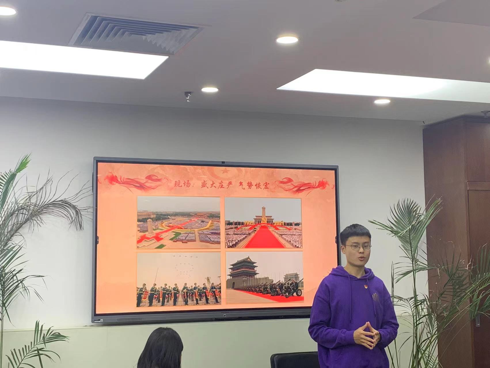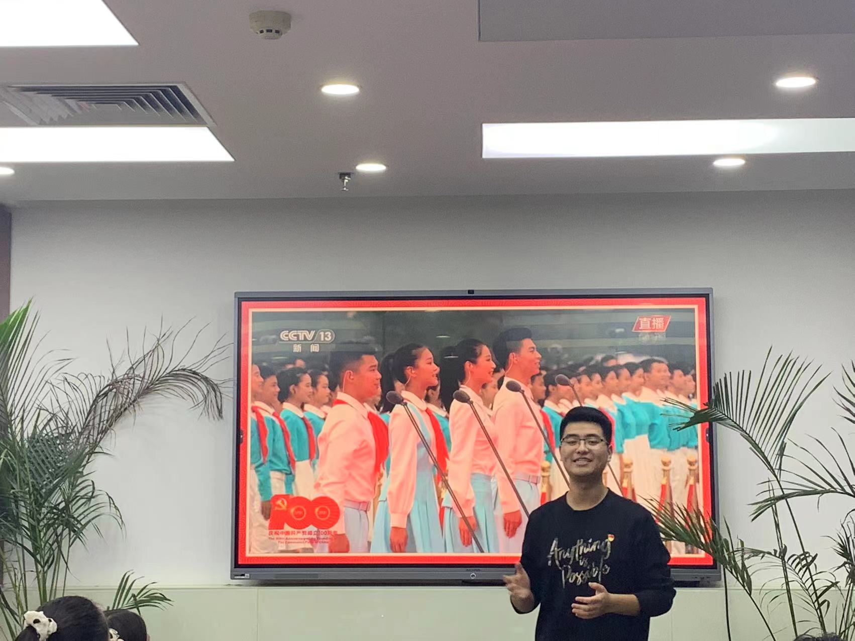 之后,由恵晓辰进行了以“梅花香自苦寒来”为主题的分享。作为本次庆祝中国共产党成立100周年大会广场合唱团的一员,他向支部成员们分享了从3月29日到7月1日之间的训练经历,通过超过200小时的刻苦训练,最后换来了正式演出时的精彩呈现,他感到特别的骄傲与自豪。