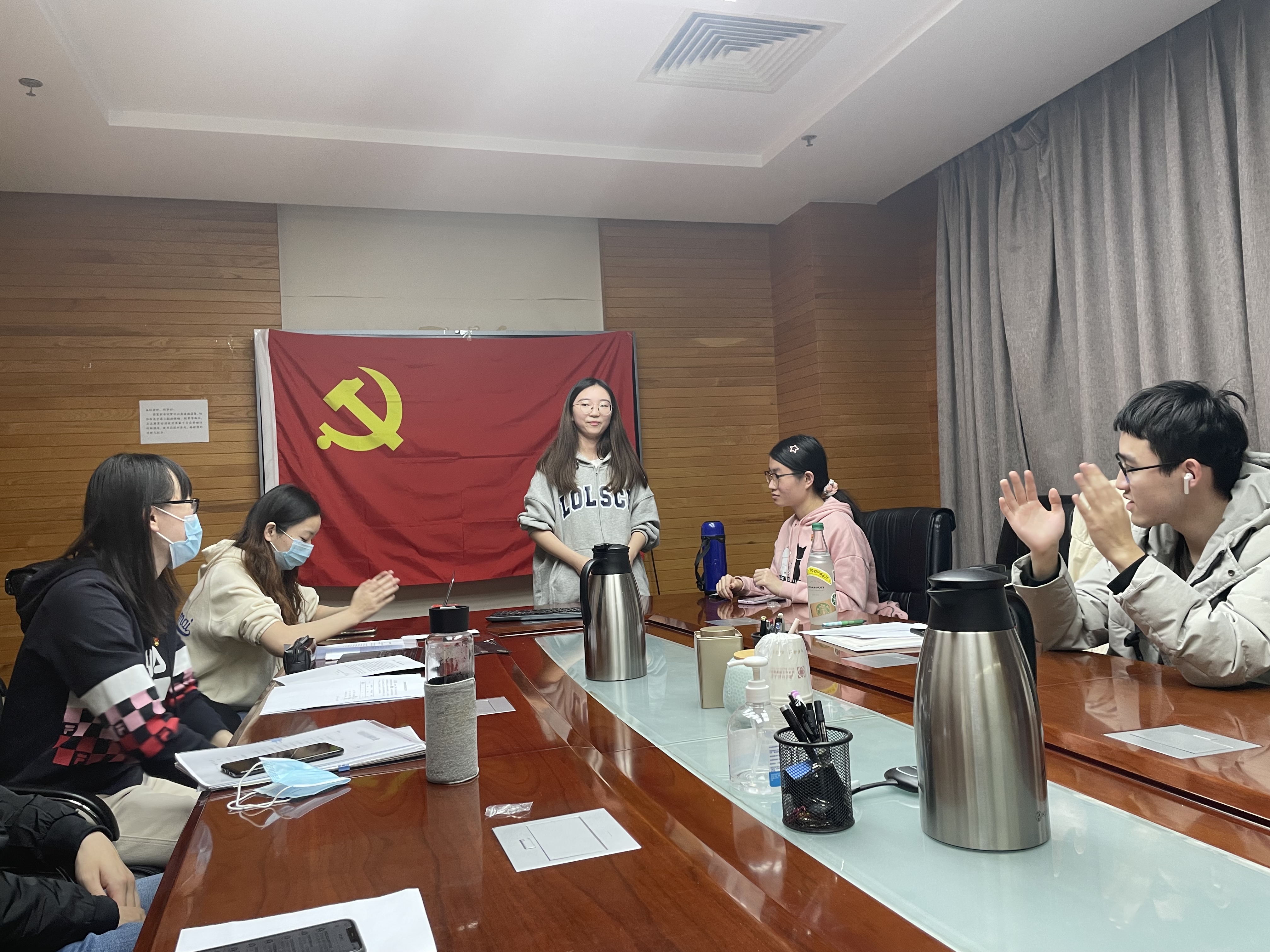 首先,在齐祺同志的主持下讨论入党申请人转为积极分子的事宜。支部党员经过讨论与表决,通过了关于接收刘泓延、李佳洲、陈俞润、卢祖玲四位同志为入党积极分子的相关事宜。