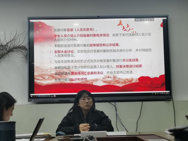 最后,支部大会讨论杨笑鸣、王琢琬两位发展对象的发展事宜。王琢琬同志宣读了入党志愿书。教师入党介绍人常欣扬老师宣读入党介绍人意见。她认为王琢琬同志作为2020级金融班的学习委员,学业成绩优异,获评三好学生,现任辩论队现任队长,希望其后续能够积极参加党支部活动,认真学习理论知识,愿意介绍其加入中国共产党。学生入党介绍人徐荧同志也宣读入党介绍人意见,表示愿意介绍其加入中国共产党。李明蔚同志宣读王琢琬同志的政审报告和公示情况,正式党员对王琢琬同志的优缺点进行讨论。支部大会通过无记名投票同意接收王琢琬成为预备党员。