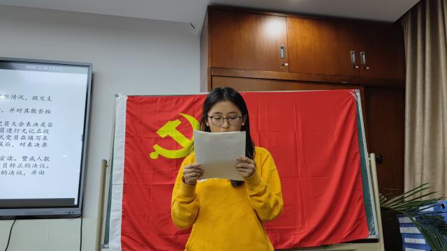 马晓君同志在党旗下宣读《转正申请书》,汇报了自己在预备党员考察期间的思想,学习和生活情况。马晓君同志表示,她在思想上认真学习,生活和实践中加强党性修养,坚定自身的理想信念,也认识到树立远大理想的重要性,在此期间,她的思想觉悟在不断提高,也积极参加各项社会实践,向一名合格的正式党员迈进。刘松月同志介绍其在预备党员考察期内的表现,与会党员充分讨论其优缺点并提出改进意见,6名与会正式党员采用无记名投票的方式对是否同意其按期转为正式党员进行表决,大会通过王佩琪同志计票、王盈斐同志监票,刘松月同志依次宣读票决情况汇总表和大会决议,大会通过马晓君同志按期转为正式党员的申请。马晓君同志也表示,非常荣幸成为正式党员,虽然因为学业繁重存在与党组织联系不够密切的缺点,但会改正缺点,向优秀的正式党员学习。