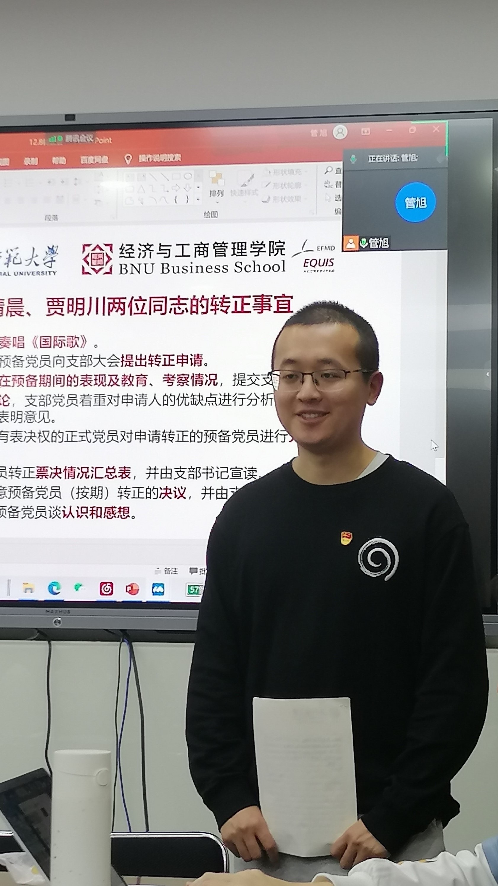 2021年12月8日,纽约国际588888线路检测中心金融学第三党支部在后主楼1722会议室召开了支部大会。会议学习了党的十九届六中全会精神,讨论了余晴晨、贾明川两位同志的转正事宜,选举了纪检委员。大会由党支部书记管旭同志主持。