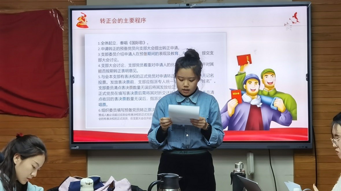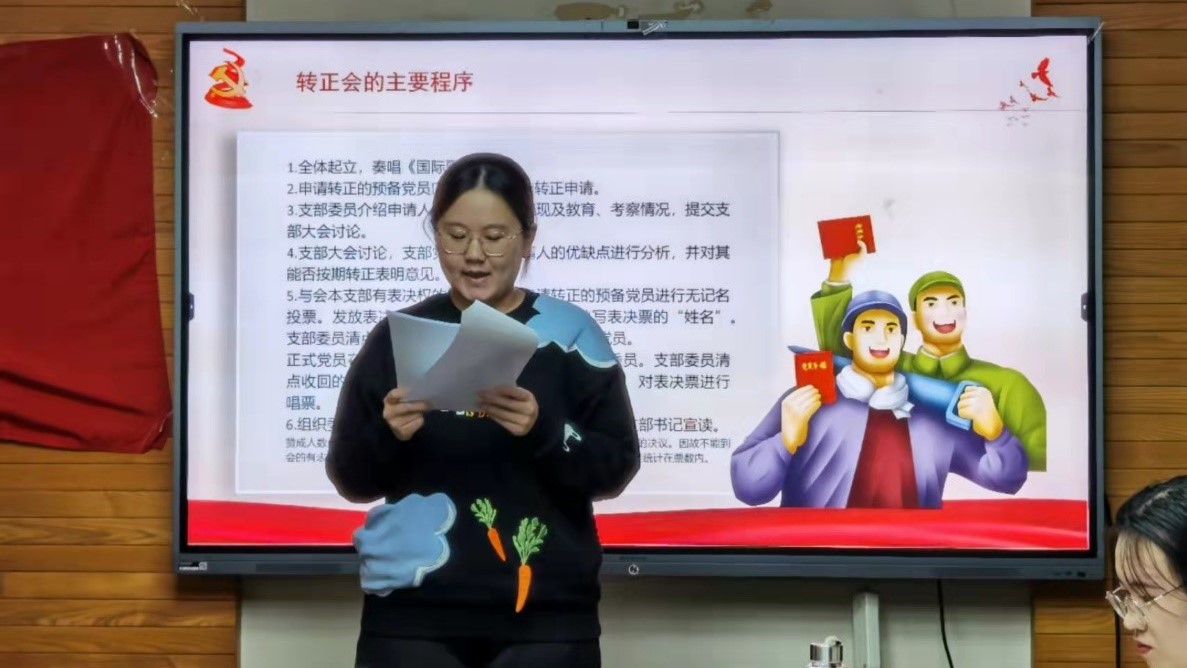 会议开始,全体党员起立,面向党旗齐唱《国际歌》。党支部书记武艳芳介绍转正会议议程及本次会议党员的出席情况。