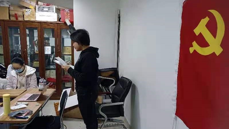 冒雅言同志在党旗下宣读转正申请书,汇报了成为预备党员一年来的思想、工作、学习的情况。冒雅言同志表示,在过去的一年里,在党组织的培养教育下,自己能够利用现有资源积极提高自己的思想觉悟,养成了每日阅读时事评论的习惯。同时她以党员标准严格要求自己,投身于志愿防疫工作前线,践行全心全意为人民服务的宗旨。针对自身缺点,她提出了改进计划。
