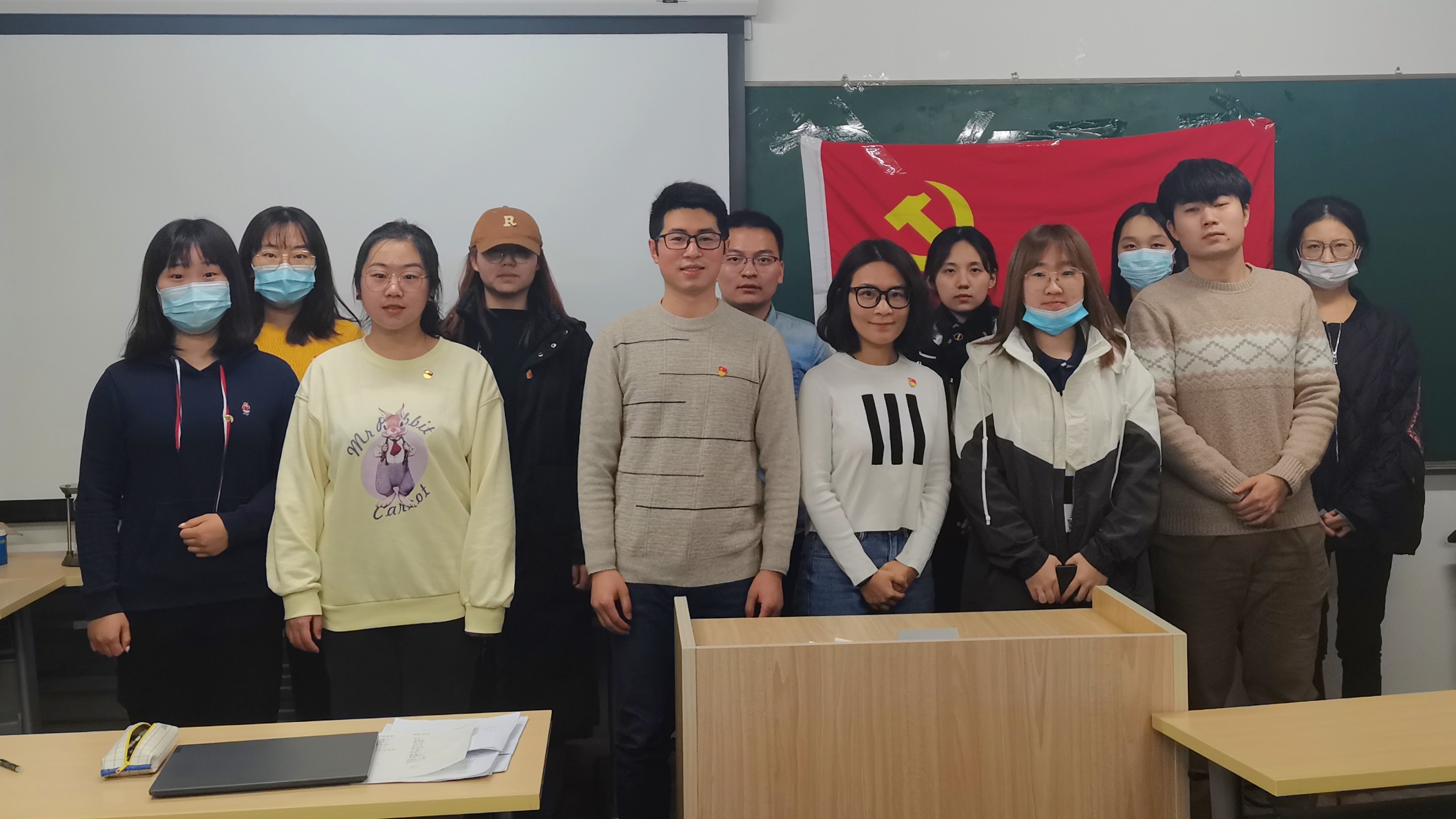 会议开始,全体党员起立,面向党旗奏唱《国际歌》,支部书记赵新宇介绍本次党员大会的主要议程以及出席人员情况。