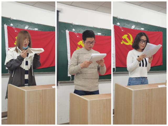 随后,大会讨论了关于预备党员周立、王超以及黎骅逸同志的转正事宜。三位同志依次在党旗下宣读《转正申请书》,汇报了自己在预备党员考察期间的思想,学习和生活情况,表达了对按期转正的恳切希望。支部副书记彭锐分别介绍了三位同志在预备期内的表现、教育及考察情况,交由支部讨论,在场的正式党员对三位同志的优缺点展开探讨,充分发表了自己的看法,并对其能否按期转正表明了意见。在无记名投票阶段,大会指派副书记彭锐同志监票,支部秘书张力宁同志计票,对预备党员转正表决票进行了唱票,三名申请转正的预备党员均获得全票赞成。赵新宇同志分别宣读了票决情况及大会决议,同意三位预备党员按期转正。三位同志分别谈到转正后的感想,表达了对党组织的感谢,并表示今后将继续扬长补短,发挥党员的先锋模范作用,践行自己爱党爱国的誓言。