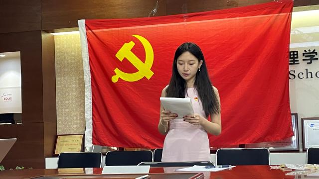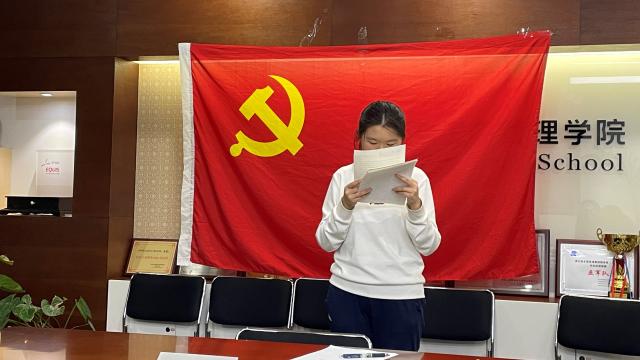 谢馨瑶同志在党旗下宣读转正申请书,汇报了自己在预备党员考察期间的思想、学习和生活情况。她认识到树立远大理想的重要性,不断坚定理想信念,加强政治理论学习,在实践中增强党性修养,积极参加社会实践,向一名优秀的正式党员迈进。