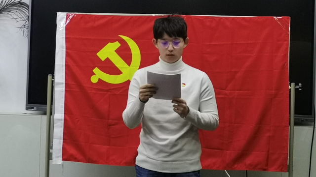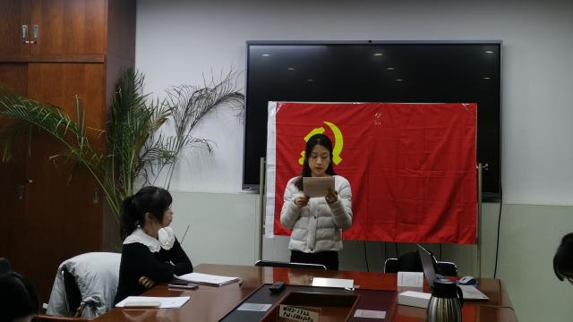 会议开始,全体党员起立,面向党旗奏唱《国际歌》,支部书记张天硕介绍本次党员大会的主要议程以及出席人员情况。