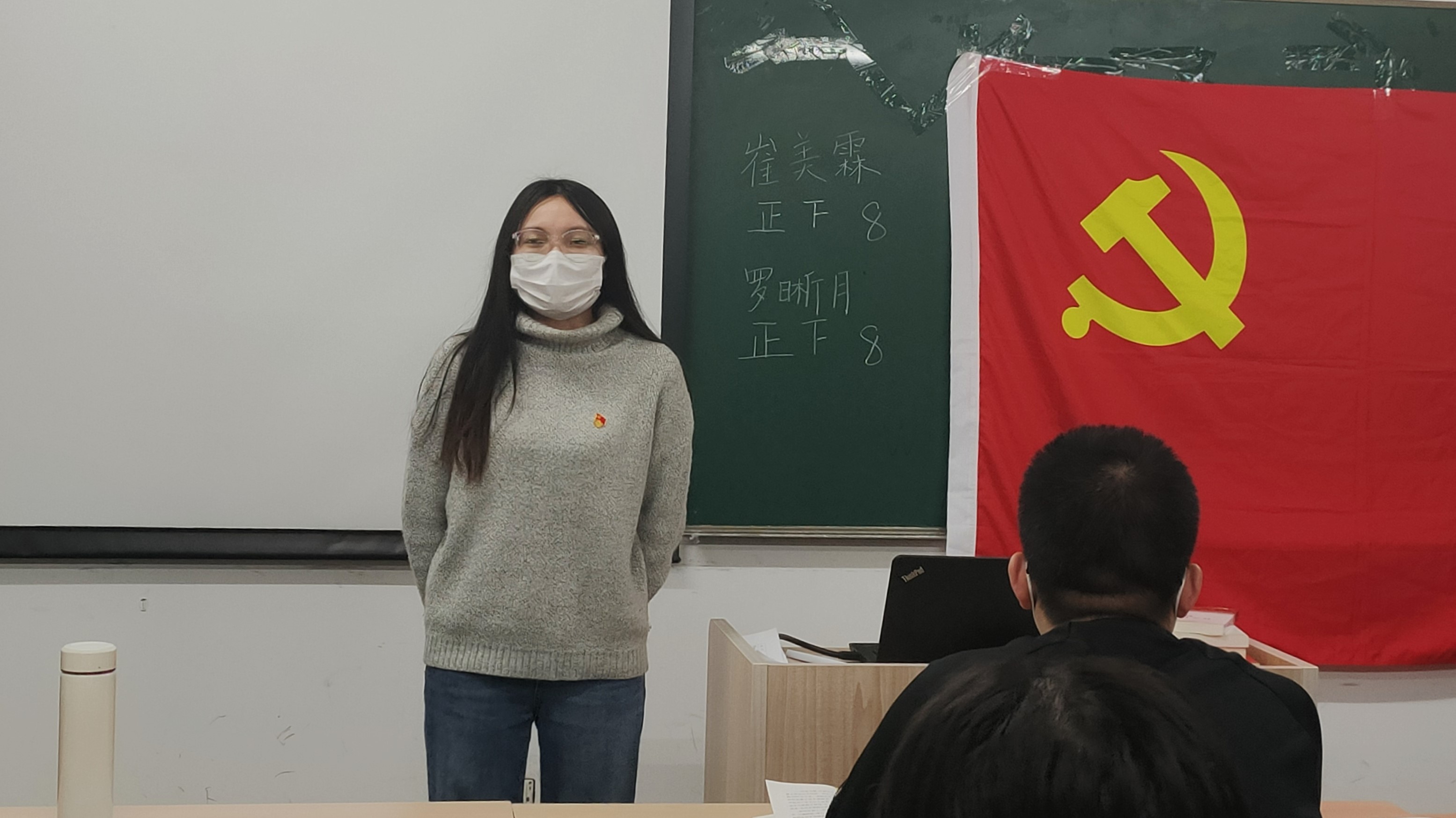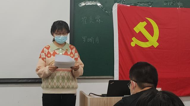 会议开始。全体成员起立,面向党旗高唱《国际歌》。接着,崔美霖、罗晰月两位同志依次宣读了自己的转正申请书,向党组织汇报个人在预备期间学习、工作、生活等方面的表现,阐述了自己在预备期内思想态度的变化过程,表达了对成为正式党员的渴望。随后,支部书记向大会介绍了预备党员的基本表现情况。支部大会对两位同志的优缺点进行了充分讨论,帮助其更好认识自我,并希望其在今后扬长避短,取得更大进步。与会有表决权的正式党员进行无记名投票,由监票人王雯柯同志和计票人史慧一同志唱票。宣传委员王禹宁同志填写接收预备党员票决情况汇总表并由支部书记杨理钧宣读,两位预备党员均获全票通过。支部书记杨理钧同志宣读同意两位同志按期转为正式党员的决议。最后,崔美霖、罗晰月分别向大会表达了自己的感想与认识,表示今后将更加严格要求自己,不断进步,向党员先锋模范看齐。