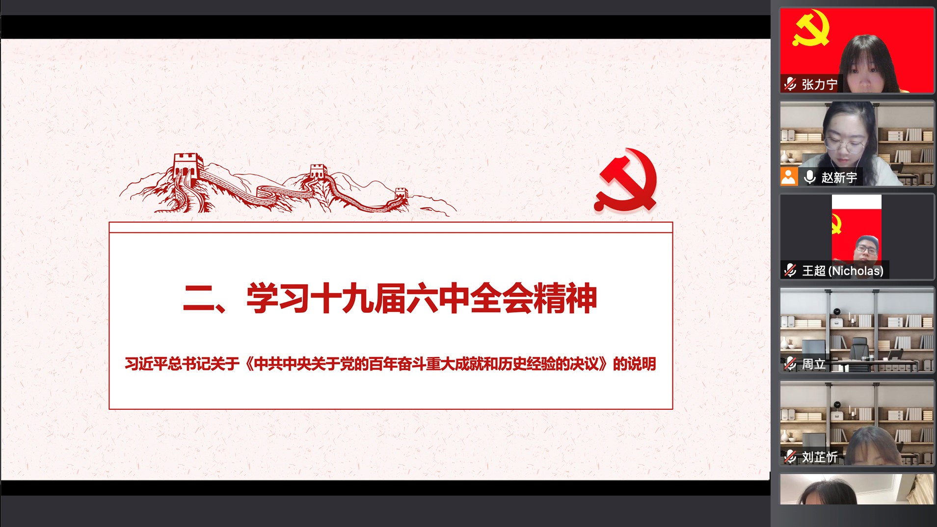 首先,全体成员共同学习了习近平总书记关于《中共中央关于党的百年奋斗重大成就和历史经验的决议》的说明,进一步了学习了《决议》的基本框架和主要内容。在讨论环节中,黄梦霖同志和肖锟泓同志发表了自己的感想,表示《决议》深刻总结中国共产党一百年来从小到大、从弱到强的成长历程,我们要深刻认识加强党的政治建设的重要性,增强全党团结统一的自觉性和坚定性。在新的征程上,为了实现第二个百年奋斗目标,我们要坚持和发扬党的十八大以来的新经验,增强“四个意识”、坚定“四个自信”、做到“两个维护”,团结一致向前看。