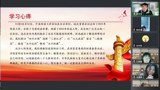 首先,全体成员共同观看了习近平总书记在中央经济工作会议上的讲话视频。习近平总书记在会上总结了2021年经济工作,分析了当前经济形势,部署了2022年经济工作。支部成员梁明安向大家总结了会议的主要内容:会议指出了4个“必须”,提出了2022年的7项经济部署以及5个“正确认识和把握”,以保持平稳健康的经济环境、国泰民安的社会环境、风清气正的政治环境。梁明安还就习近平总书记讲话分享了他的心得体会,指出从个人角度要做好疫情防控工作,在国家需要时挺身而出,为国家安全和经济建设努力奋斗。凝聚共识、坚定信心、真抓实干,做好分内之事,以迎接党的二十大胜利召开。