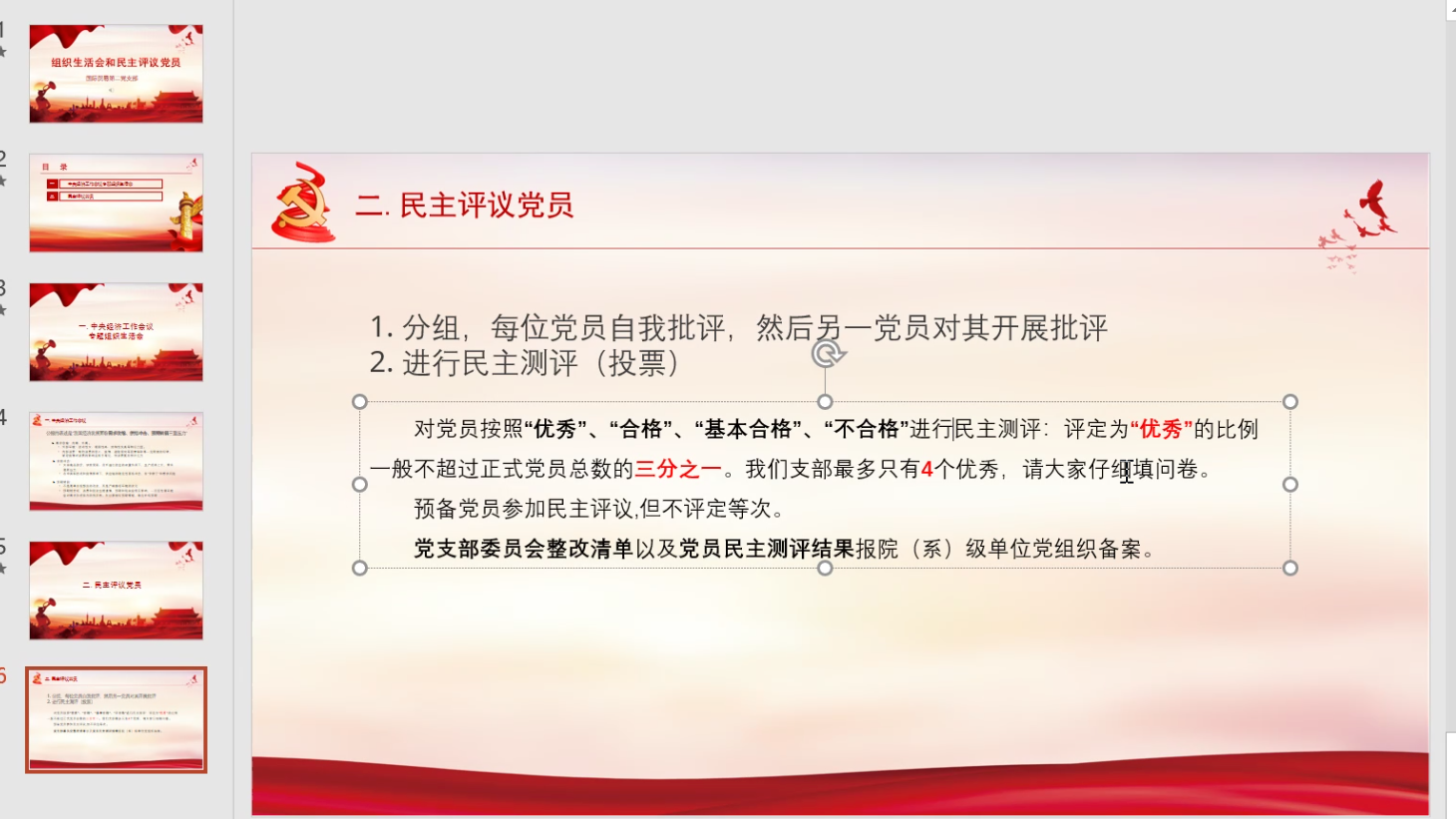 最后,大会开展民主评议党员。大家通过线上匿名填写问卷的方式,综合各位党员的日常表现,最终确定武艳芳、吕芳、李显、姜玫如获评优秀。