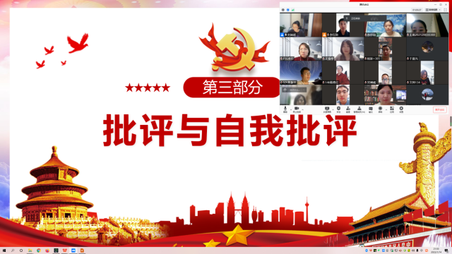 最后,支部党员逐个进行批评与自我批评。较多同学表示存在对党的理论知识、方针政策的学习不足,与党内同志的沟通较少,学习和工作难以平衡等问题。支部党员对其他党员也做出了客观的批评,为彼此提出了整改意见。大家通过线上匿名填写问卷的方式对党员进行民主评议。结合党员日常表现,最终刘静玟、杨澎、卢忍、王颖、韩春红、李巧共6名党员获评优秀。