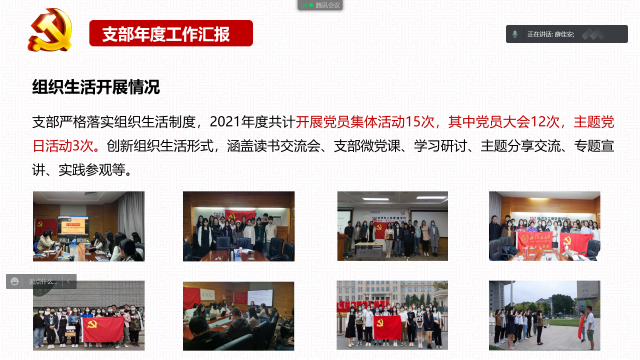 首先,全体成员听取了支部年度工作汇报,支部书记薛佳安代表支部委员会进行述职,从党员发展与管理工作、组织生活开展情况、支委会建设情况和党史学习教育开展情况四个方面对2021年度工作进行了总结,并就党史学习教育专题组织生活会中支部查摆问题整改落实情况进行了汇报。