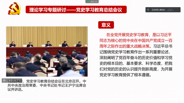 接着,全体成员共同学习了党史学习教育总结会议精神。习近平总书记指出,要认真总结这次党史学习教育的成功经验,建立常态化、长效化制度机制,不断巩固拓展党史学习教育成果。支部成员结合大会精神及参与支部组织生活情况,对这一年的党史学习进行了阶段性的总结。王为凤同志认为,通过参观博物馆、红色教育基地等实践活动,从真实的历史展品中感悟党走过的百年历程,对于党史学习较以往更加深入。王祉颖同志表示,从党辉煌的百年历史中看到了一代代共产党人的优良品质,感悟到了家国情怀,坚定不移跟党走,才能更好地为人民服务。支部成员一致认为,要将党史学习教育贯穿理论学习的始终,坚守初心使命、坚定理想信念,更好地发挥党员的先锋模范作用。