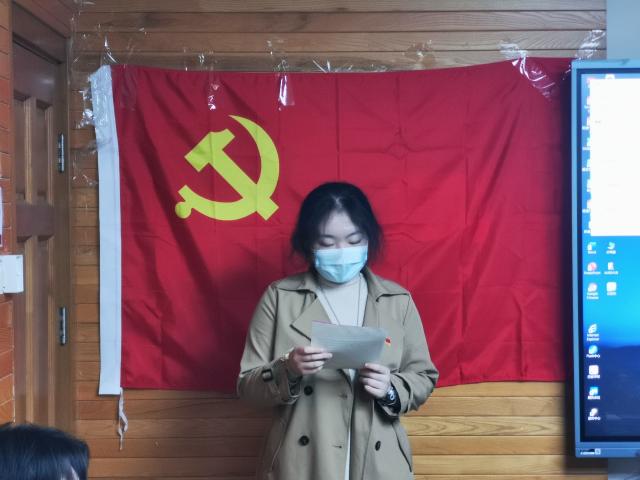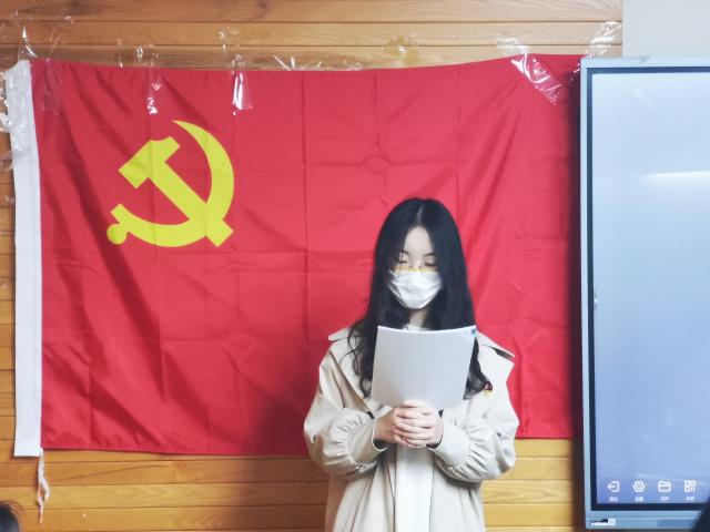 霍雨佳同志在党旗下宣读转正申请书。霍雨佳同志讲述了她在预备期间做出的努力。在思想政治方面,她积极参加理论学习,热心关注时事;在学习方面,在本专业的学习之余辅修了法学,提高自己的专业能力;在工作和生活方面,她带领学生会外联部策划筹办了一系列活动,为同学们做出很多贡献。同时她也提出自己存在理论知识需要加强、与其他同志交流不够密切的问题。