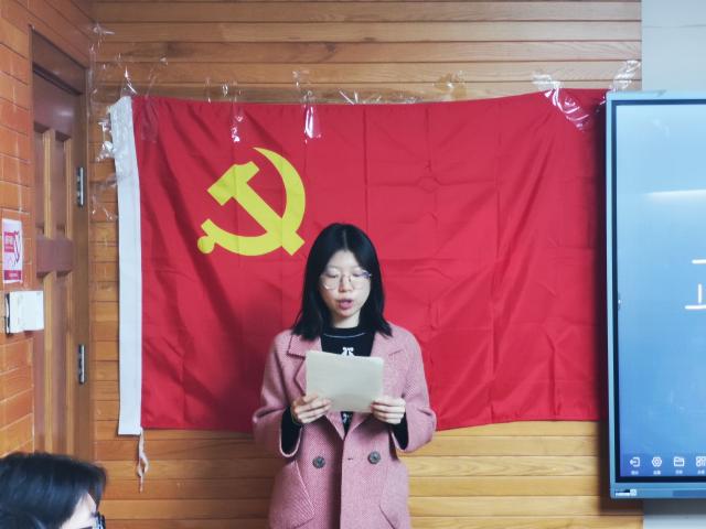 杨玉婷同志在党旗下宣读转正申请书。杨玉婷同志汇报了自己预备期间在学习、工作、生活、思想等方面的情况。她谈到了自己一年来参加的理论学习和实践活动,在这些活动中不断增强自己的理论水平和思想修养,时刻以一名正式党员的标准严格要求自己。同时,她指出自己存在做事容易急躁、与其他支部成员交流不够密切的问题,提出今后继续向支部的党员同志多多学习,不断提高自己。