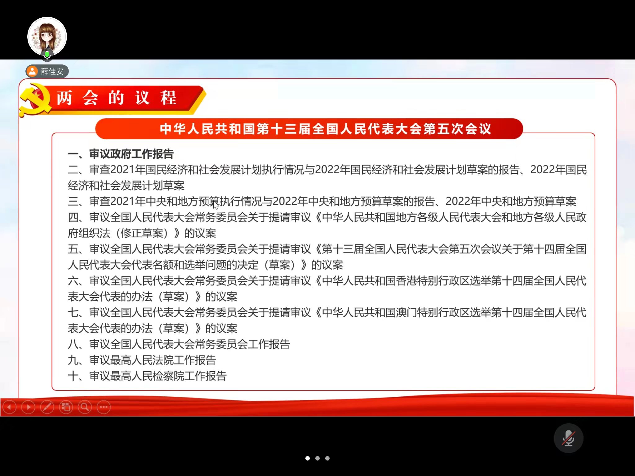 首先,支部书记薛佳安同志向大家介绍关于两会的小知识,包括两会的组成、两会的议程等。接下来,她带领大家对2022年政府工作报告的主要内容进行了回顾,主要包括2021年工作回顾、2022年经济社会发展总体要求和政策取向、2022年政府工作任务等三方面内容。报告指出,中国政府将在新的一年里进一步保民生、稳就业,完整、准确、全面贯彻新发展理念,加快构建新发展格局,推动高质量发展,扎实做好各项工作。