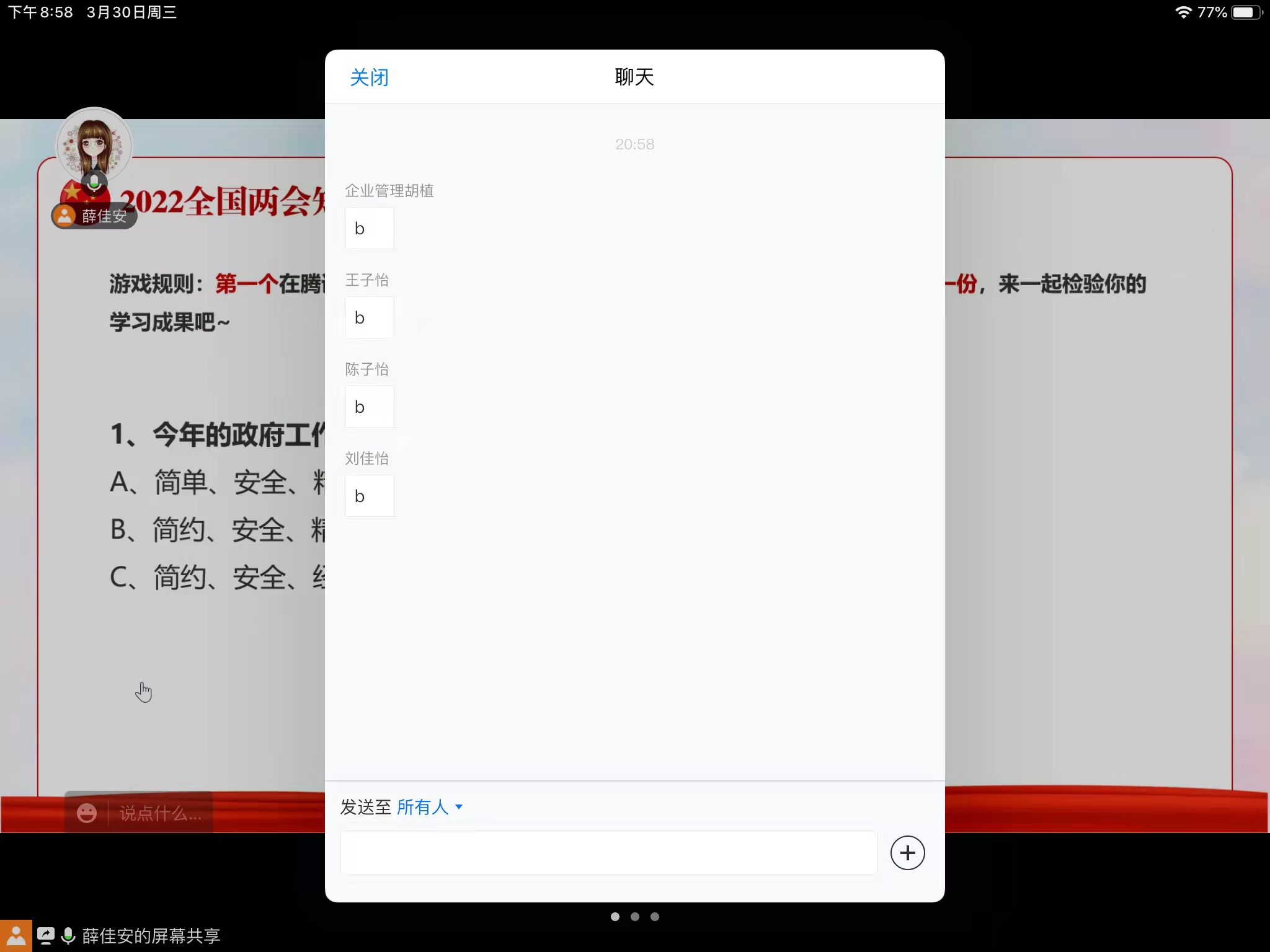 随后,支部组织了2022全国两会知识竞答活动,以检验大家的学习成果。在该环节中,大家踊跃发言回答,寓教于乐,以游戏问答的形式加深了对两会精神的学习,扩展了关于两会的知识面。
