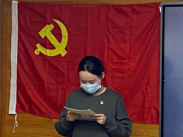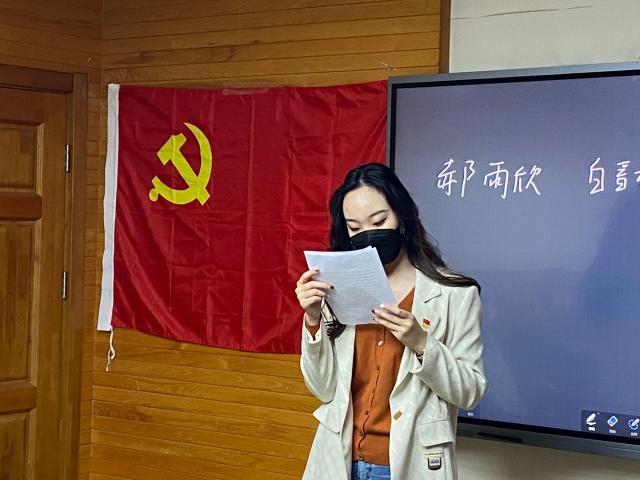 白晋楠同志在党旗下宣读转正申请书。在工作生活方面,她在班级中担任学习委员,不遗余力地为同学们热心服务;同时,她担任党支部的联络员,积极参加党支部活动。她指出自己情绪管理能力欠佳、理论学习不足。表示今后会主动调节压力、加强理论学习,争取更大进步。