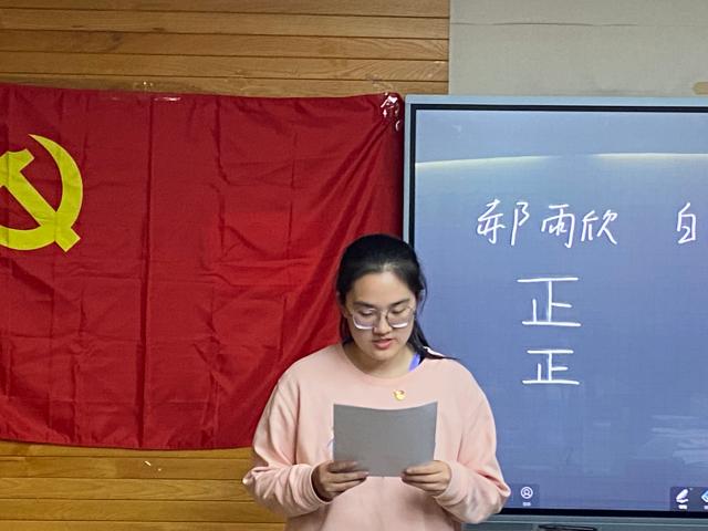 郝雨欣同志在党旗下宣读转正申请书。郝雨欣同志汇报了自己预备期间在学习、工作、生活、思想等方面的情况。她谈到了自己一年来参加的实践活动、志愿服务活动,在这些活动中不断增强自己的思想修养和政治觉悟。她也指出自己存在应用能力不足、做事容易忽略细节的问题,提出今后更加严格要求自己、不断提高自己。