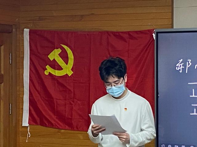 李泽根同志在党旗下宣读转正申请书。李泽根同志讲述了预备期间内的进步。他担任支部联络人,认真参加理论学习,积极参加党支部的各项活动,并努力改正了做事急躁的缺点。同时他提出要与其他同志加强交流、加强专业学习。