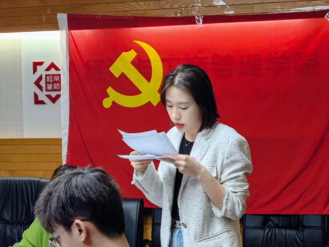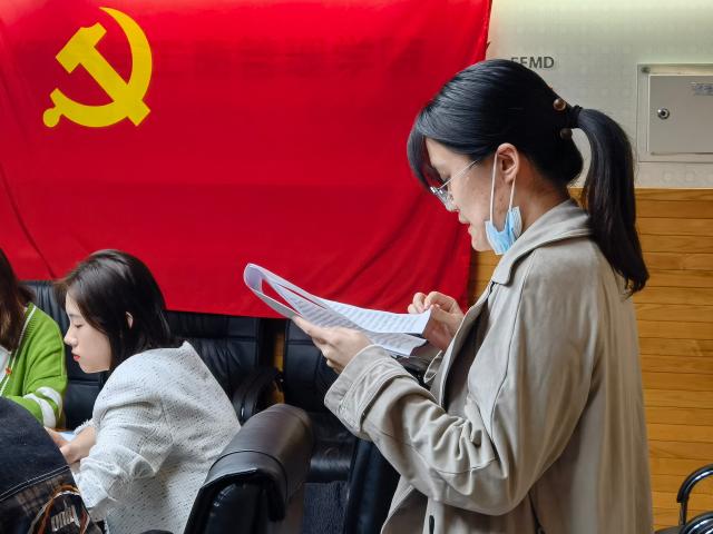 2022年4月11日,纽约国际588888线路检测中心工商管理第一党支部于后主楼1610会议室召开党员转正会,讨论关于郭雪俐、蔡慧莹、柴逸群、秦贵杭四位同志的转正事宜,并集体学习两会精神。会议由党支部书记顾柠同志主持。