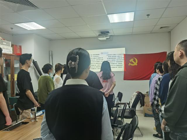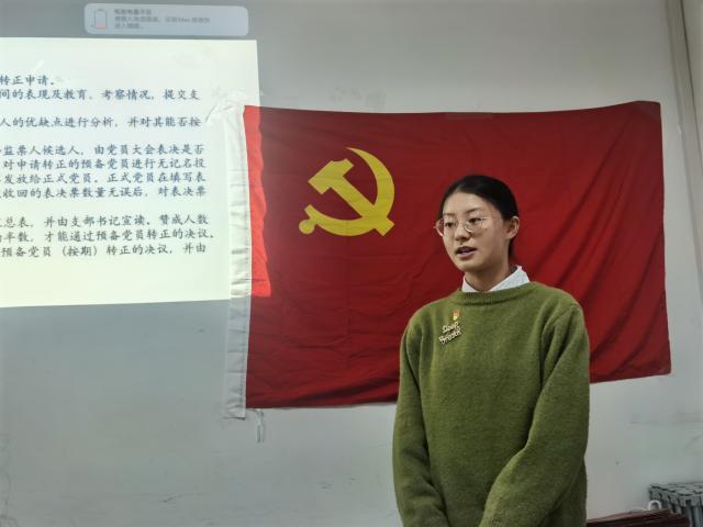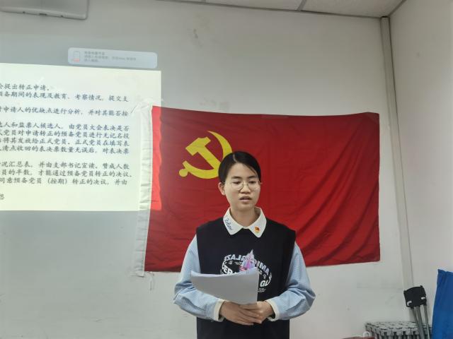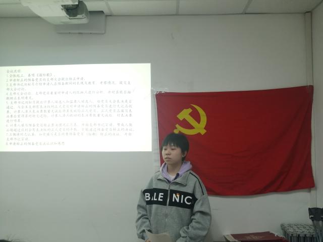 会议开始,全体党员起立,面向党旗齐唱《国际歌》。党支部书记刘松月介绍转正会议议程及会议出席情况。