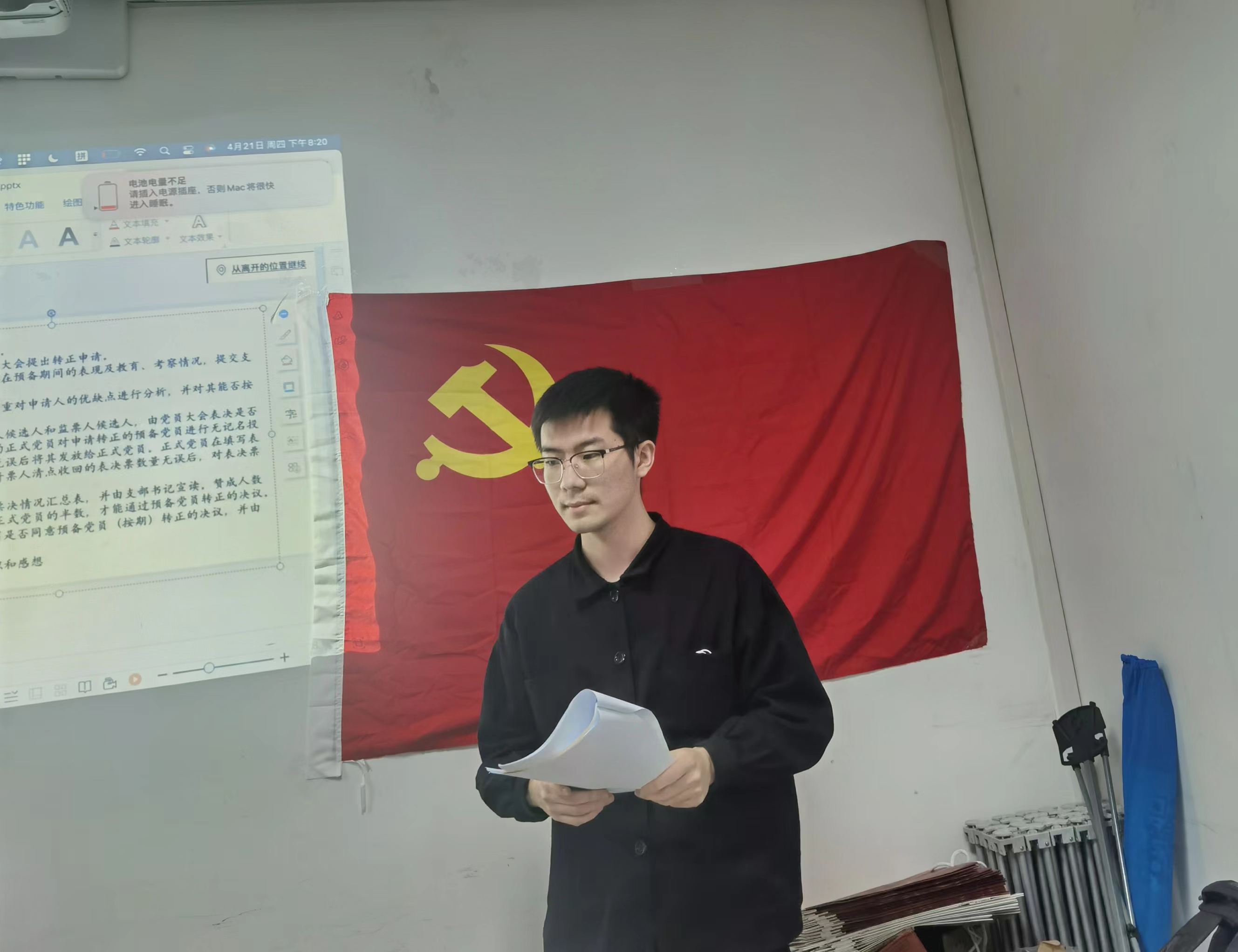 4月21日大会依次讨论了关于陈立东、刘欢、张思域和阮梦舴四位同志的转正事宜,4月22日大会依次讨论了关于贾宏睿、罗迅和刘昊月3位同志的转正事宜。首先,申请转正的同学向支部大会提出转正申请。随后支部书记刘松月同志介绍了该名预备党员考察期间的各项情况。支部大会充分讨论了申请人的优点和缺点,并对其能否按期转正表明了意见。与会有表决权党员对申请人进行无记名投票,并通过正式党员王佩琪作为计票人、正式党员惠晓辰作为监票人进行唱票。大会投票通过了陈立东、刘欢、张思域、阮梦舴、贾宏睿、罗迅和刘昊月等7位同志按期转正的申请。