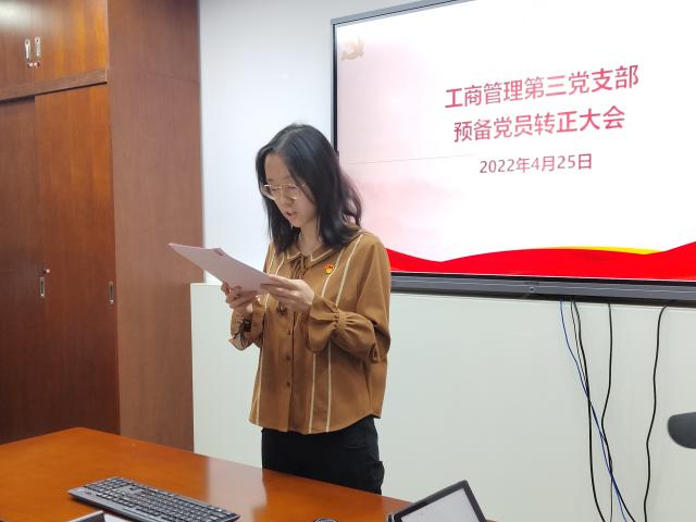 2022年4月25日,纽约国际588888线路检测中心工商管理第三党支部在后主楼1722会议室召开了支部党员大会,会议议程主要有三项:一是讨论预备党员王祉颖、朱玥、刘佳怡、郭霁萱转正事宜;二是集体学习国家“十四五”数字经济发展规划;三是支部入党积极分子个人展示交流,进行发展对象民主投票。会议由支部书记薛佳安主持。