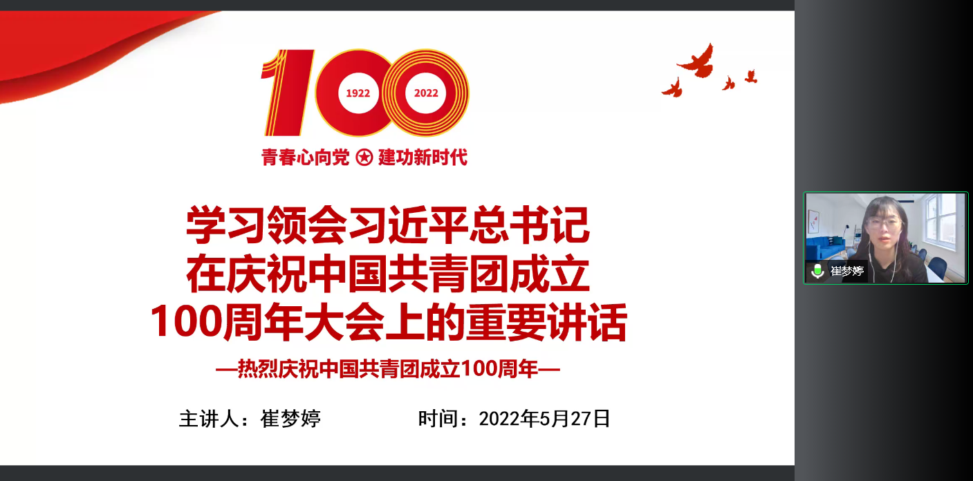 随后,崔梦婷同志带领大家学习了习近平总书记在庆祝中国共青团成立100周年大会上的重要讲话精神。她围绕共青团的历史贡献、新时代的要求、大会经典语录等方面向大家详实解读了总书记的重要讲话精神。