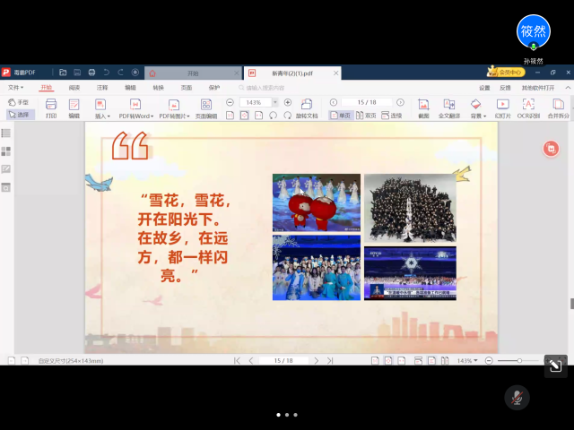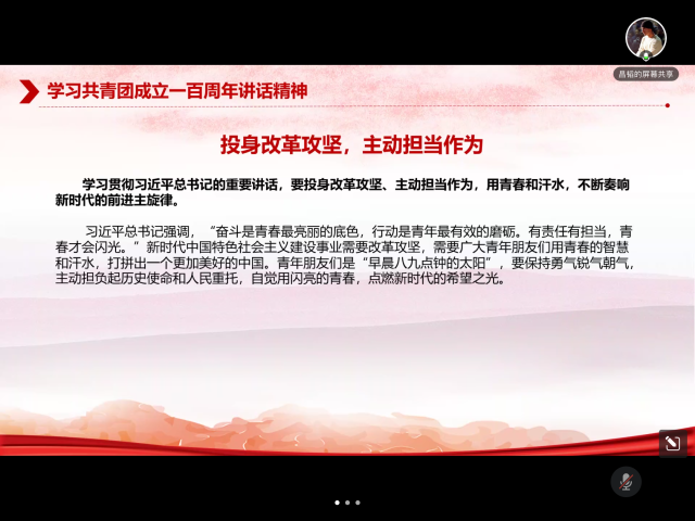 之后,与会同学结合亲身经历和习近平总书记考察中国人民大学时的重要讲话精神学习新青年的责任担当。在党革命和建设的各个历史时期,青年都承担着不同的时代使命。新时代的我们,在脱贫攻坚中唱响青春之歌,在百廿党恩中沐浴青春风华,在冬奥盛典中贡献青春力量,在抗击疫情中展现青年担当。支部内李果同志和孙筱然同志分别结合个人经历,讲述了作为中国共产党成立100周年庆祝大会合唱团成员和冬残奥会闭幕演职人员的心路历程。李果同志用三个多月的付出换来七一当天七首红歌响彻天安门广场,化作对党最真挚的祝福。孙筱然同志也在活动参与中克服种种困难,认识到了自己的勇敢坚强,实现了自我砥砺、成长和认同。残疾人运动员所呈现的精彩表演,也不禁让我们感叹每一个生命的熠熠生辉!同学们通过学习,充分认识了新时代新青年应如何争做堪当民族复兴重任的时代新人,与党和国家同呼吸、共命运,把“强国有我”的铮铮誓言转化为练就过硬本领的铿锵行动。