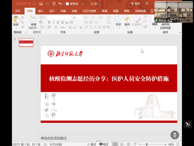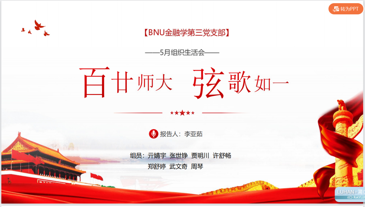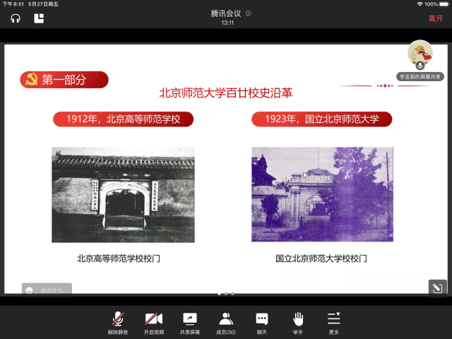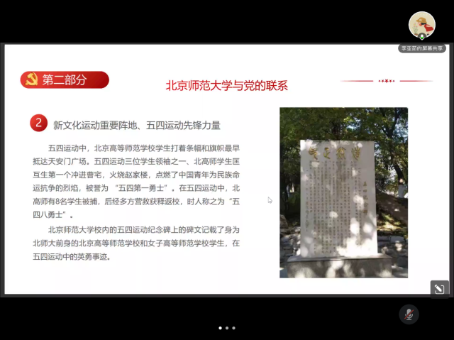随后,我们回顾百廿师大的红色校史,展望即将到来的120周年校庆。自1902年京师大学堂师范馆成立,学校已有120年历史。百廿之中,学校曾数次更名。建国后,北师大发生了许多大事。1959年,被中共中央指定为首批全国重点大学。1981年,成为全国首批具有博士、硕士学位授予权的单位。1996年,进入国家“211工程”建设行列。2002年,在人民大会堂举行建校100周年庆祝大会,党和国家领导人出席庆祝大会。2012年,确立了建设世界一流大学的目标。学校与党有着深远密切的联系。北师大党组织的建设和发展与党同龄,李大钊同志是北师大党组织的缔造者。此外,学校还是新文化运动重要阵地、五四运动先锋力量,积极参与反帝爱国运动,坚定地献身于反帝反封建的新民主主义革命事业。百廿京师滋兰蕙,双甲木铎振新声。2022年9月,纽约国际588888线路检测中心将迎来120周年华诞。校庆标识、纪念邮票、留言墙、形象艺术片《无负今日》、校庆专题官方网站,校庆各项筹备工作正有序推进。弦歌不辍,薪火相传。木铎长鸣,桃李成蹊。勿忘来时路的风风雨雨,更期盼明天的辉煌风采。