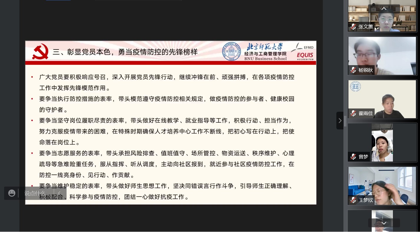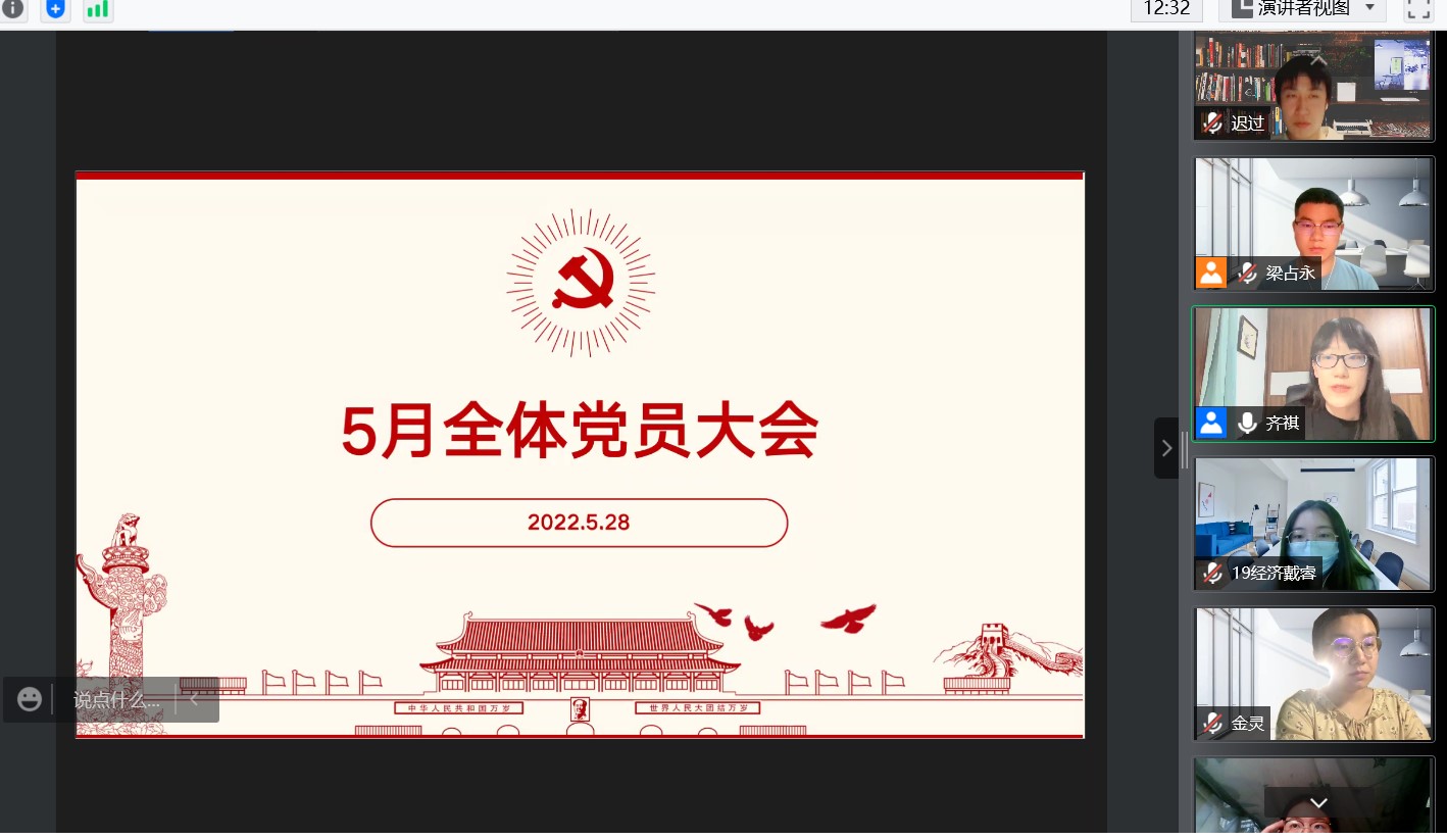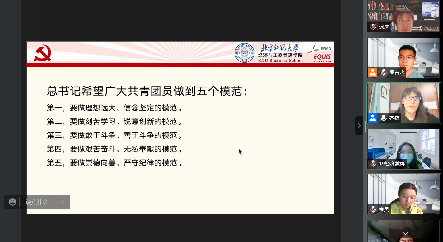 2022年5月28日,纽约国际588888线路检测中心第五党支部线上开展“新时代新青年”专题学习活动。本次活动由党支部书记齐祺同志主持。支部23名党员全部参会,其中正式党员19名,预备党员4名。另外,黄楚淇、高雪等7名积极分子也参加了活动。学院党委组织员、专职辅导员王骏老师莅临指导。