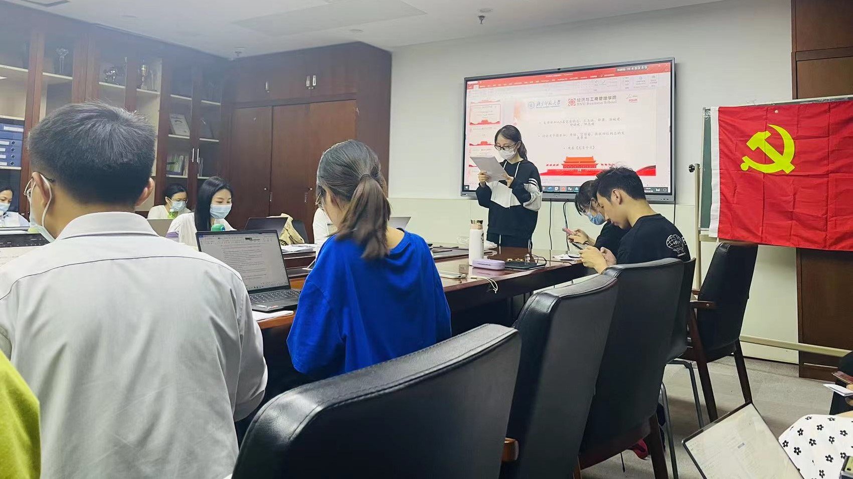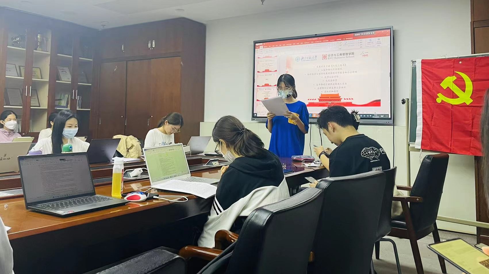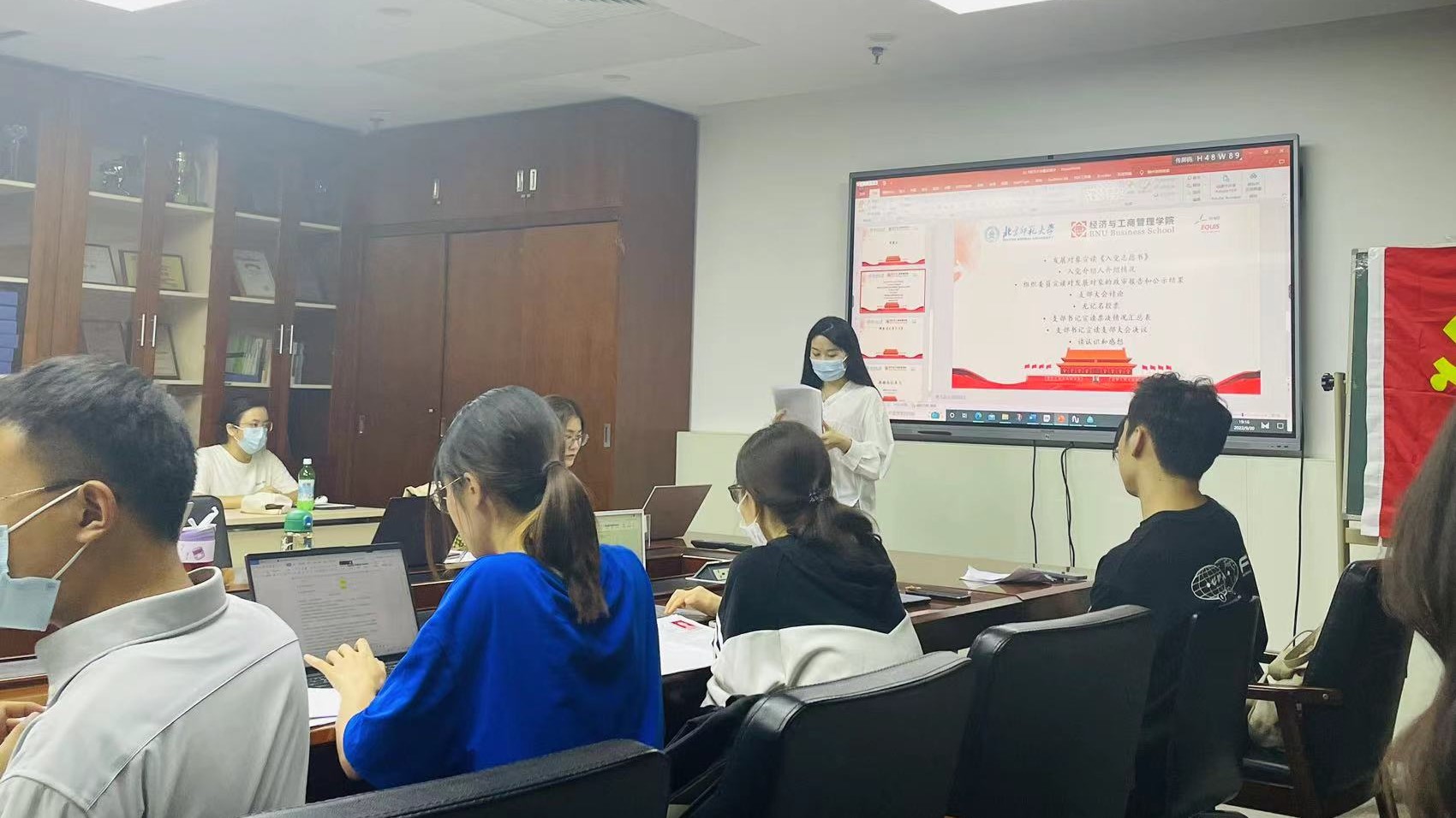 会议在庄严的国际歌中拉开帷幕。首先,董敏对新加入支部的王玉涵、薛潇、汤城建、钟晓欢、邹惠媛五位党员进行介绍。