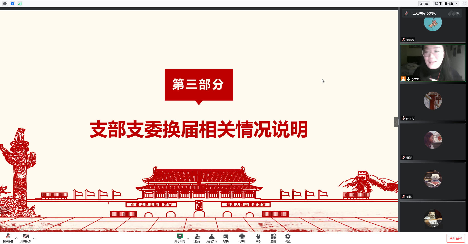 随后,支部举行支委会换届选举。在李文路同志介绍支委主要职责和竞选名单后,支部大会线上投票的方式通过了大会选举办法,并通过无记名投票的方式选举新一届支部委员会。会后,新一届委员会通过无记名投票的方式选举产生了支部书记,并讨论了各支委职责分工。新一届支委会将会不负组织重托和支部期望,认真履职,创先争优,带领支部全体成员砥砺前行,让支部各项工作更上一层楼。