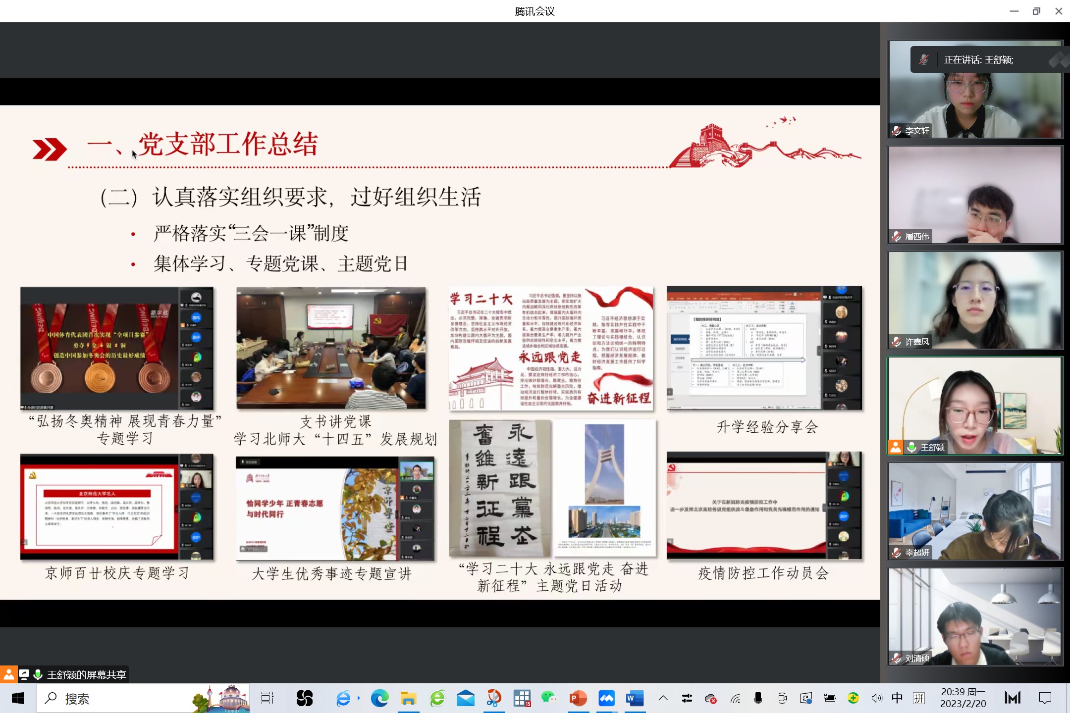 接着,王舒颖从理论学习、组织生活和支部建设等三个方面对党支部2022年度的各项工作进行总结,汇报了上一年度查摆问题的整改落实情况,并查摆本年度存在的主要问题。过去一年来,支部聚焦思想引领,扎实开展政治理论学习,认真落实组织要求,过好组织生活,明确组织分工,夯实支部基本建设,收获不少成果,但仍存在理论学习不够深入、实践能力有待加强,支部成员之间联系不够紧密,集体活动形式不够丰富等问题,后续将进一步丰富活动形式,完善考勤制度,集群体的力量建设好支部。