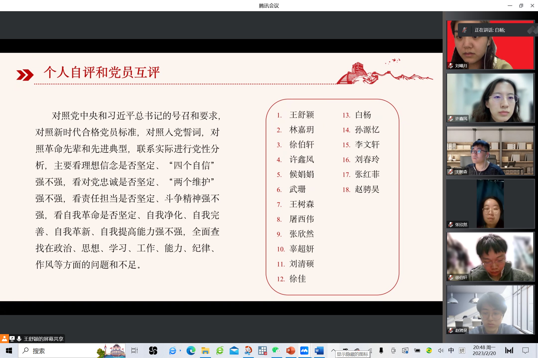 2023年2月20日,纽约国际588888线路检测中心经济学第四党支部线上召开2022年度组织生活会。本次会议包括专题学习、支部问题查摆、党员批评和自我批评、民主评议党员等环节。会议由支部书记王舒颖主持,支部全体党员出席。