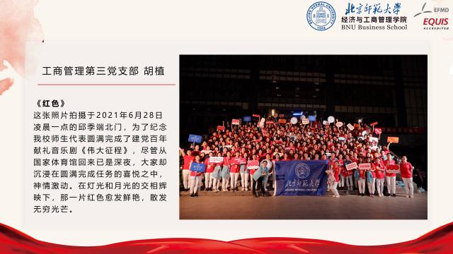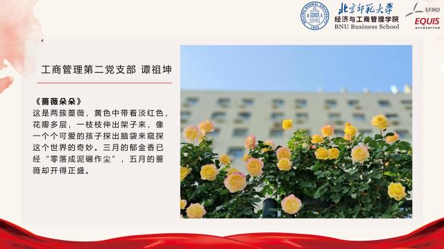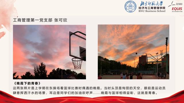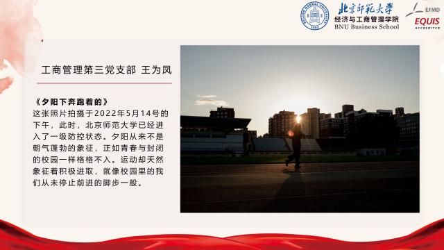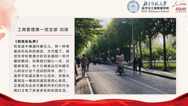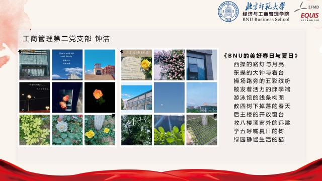 为全面提高校庆专题活动的参与性,工商管理学生党支部前期联合开展“我与师大”校园摄影活动,面向全体支部成员征集摄影作品,主题包括但不限于校园风景、校园人物、校园活动等。活动共计收到摄影作品66张,汇总故事文稿3000余字。经过多轮讨论,选出了6组具有代表性的摄影作品,邀请作品作者进行了现场分享。同学们纷纷结合拍摄背景,或是在北师求学期间的心路历程,娓娓道来了照片背后的故事,亦或是从不同的视角体验到的美好校园生活,亦或是未被注意到的校园不同角落风景,以及师大青年人的青春与活力。从每一位同学的分享中,大家都能体会到校园生活的多姿多彩,以及对北师大的深厚感情。