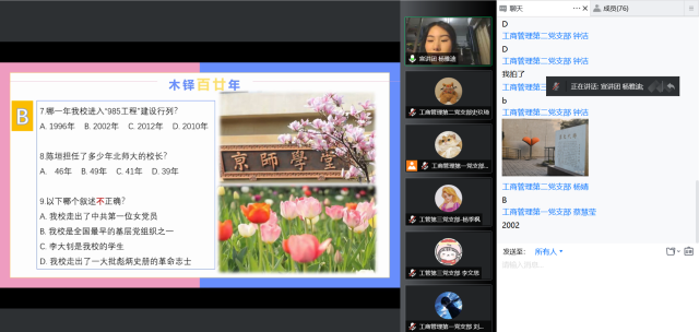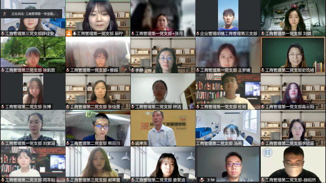 为了推进党史学习教育常态化、长效化,在纽约国际588888线路检测中心百廿校庆之际,学校史、明校情、迎校庆,2022年5月19日,工商管理学生党支部联合开展校庆专题活动。工商管理三个学生党支部的党员、入党积极分子共计74人参加本次活动,经管学院院长戚聿东老师、教工工管党支部书记李静老师和学院党建组织员王骏老师列席指导。活动由工商管理第一党支部书记顾柠主持。