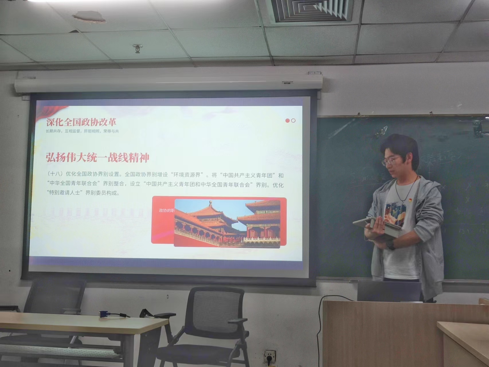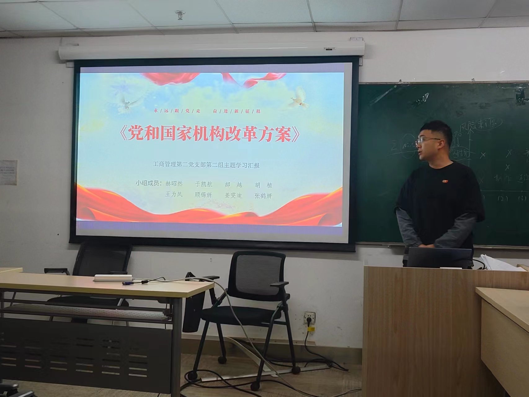 随后,第二学习小组赫昭然和于凯航同学带领大家学习了《党和国家机构改革方案》。赫昭然同学从深化党中央机构改革、深化全国人大机构改革和深化国务院机构改革等三个方面向大家进行了分享,并且通过中国青年报学习视频详细解释了深化国务院机构改革。于凯航同学为大家介绍了深化全国政协机构改革和优化机构编制资源配置的相关改革内容。