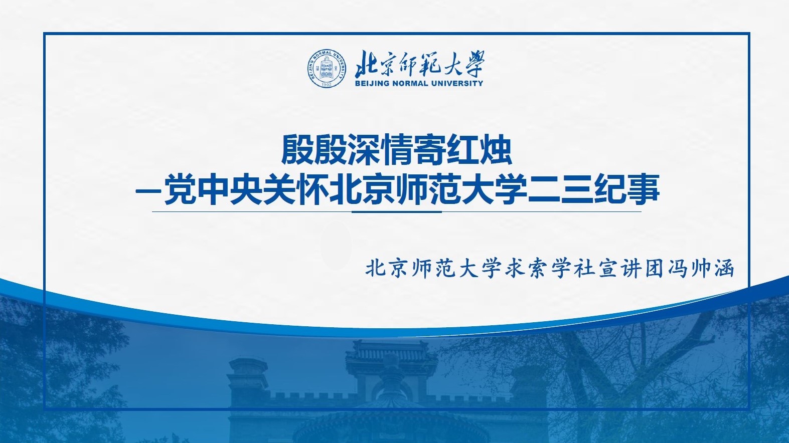 在听完这次的讲座后,我对北师大的历史沿革以及党中央对我们的关怀有了更深刻的了解和认识,听到了很多有趣的故事,学到了很多有意思的历史渊源。作为一名师大人,我感动于母校的悠久历史底蕴与文化,更自豪120年饱经沧桑与风霜,作为一名毕业生,我会时刻将校训记在心中,牢记党和国家的期待和嘱托,不会辜负师大的熏陶和教导,做一名合格的BNUer!