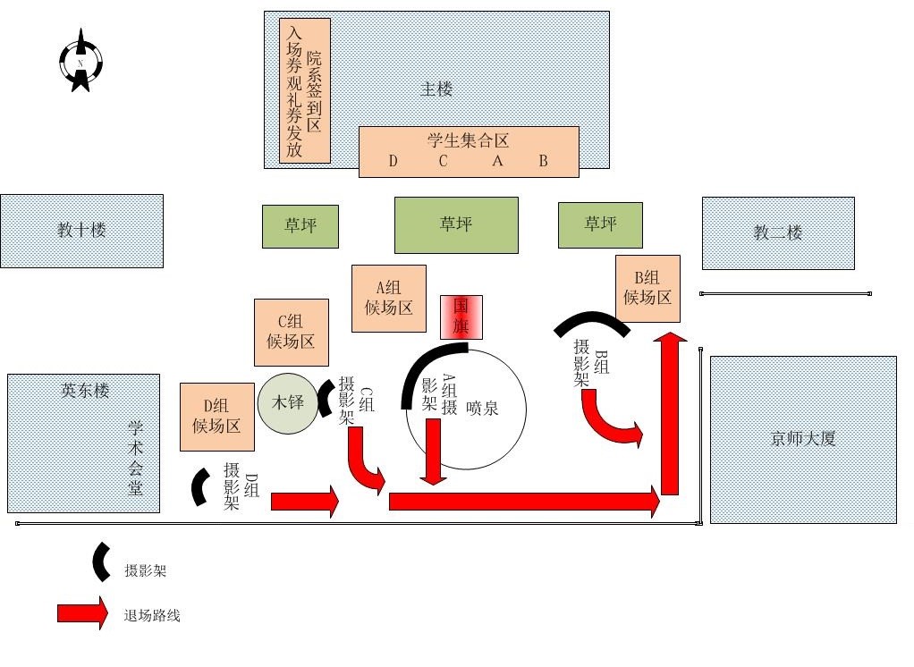 以院旗为标志集合,毕业典礼集合时将发放本人的入场券,持券集体统一入场。